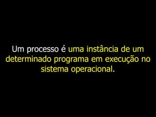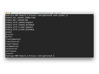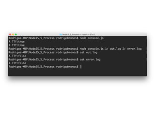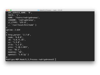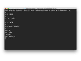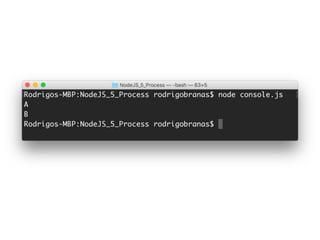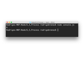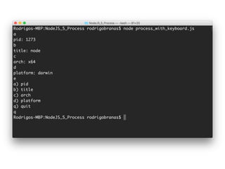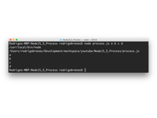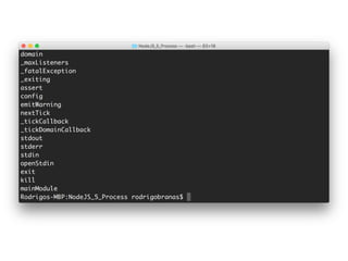 O documento discute processos no Node.js, incluindo como obter informações sobre o processo atual, lidar com streams de entrada e saída, e tratar eventos como exit e uncaughtException.