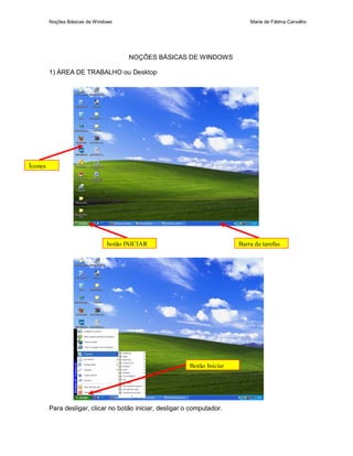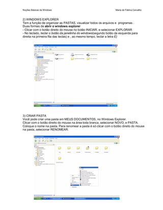 O documento fornece instruções básicas sobre como usar o Windows, incluindo descrições da área de trabalho, ícones, botão Iniciar, Windows Explorer, como criar pastas, e como usar pendrives de forma segura.