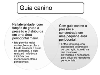 Porque as guiasde desoclusão são determinados pelos dentes anteriores?Devido à biomecânicaPara ficar mais longe possível da articulação (posterior com mais força)Sensibilidade do caninoInclinação dos dentesArcabouço de osso mais compacto