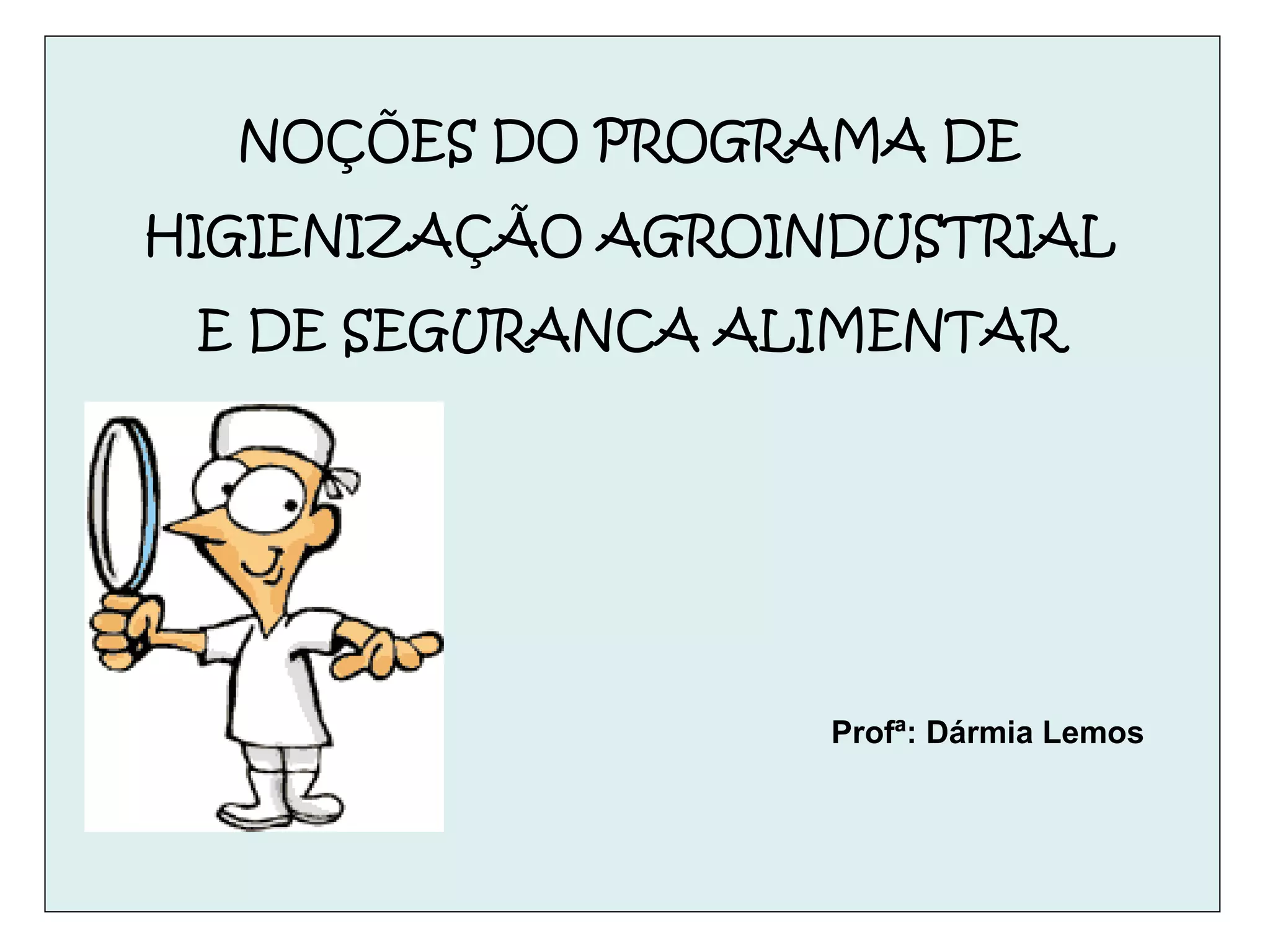 O documento discute as noções de higiene agroindustrial e segurança alimentar. Aborda os perigos biológicos, físicos e químicos que afetam os alimentos e a importância das boas práticas de higiene para manipuladores, como higiene pessoal e dos alimentos. Também destaca etapas críticas no preparo dos alimentos como cozimento e armazenamento para evitar a contaminação e proliferação de microrganismos.