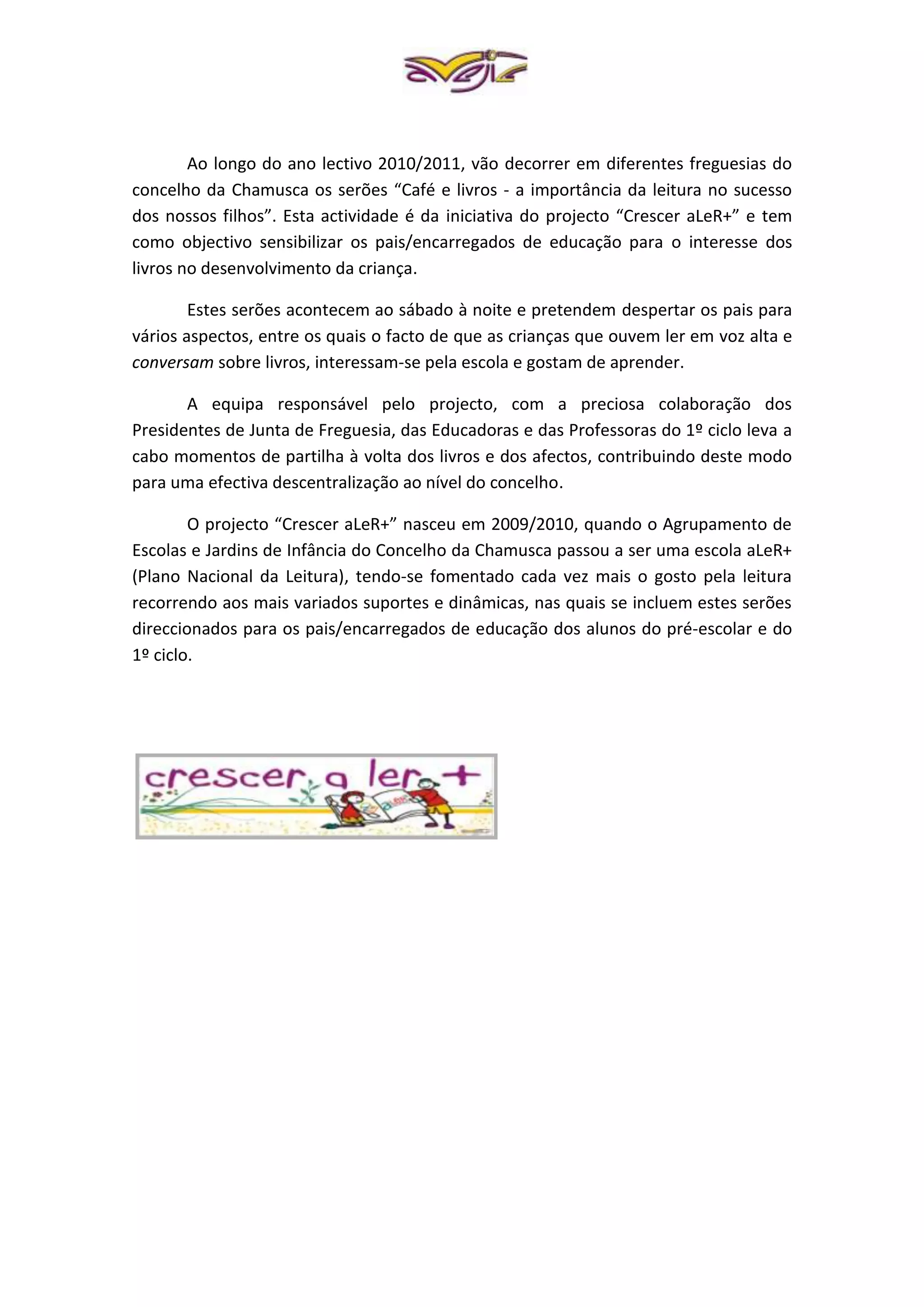 O documento descreve um projeto chamado "Crescer aLeR+" que organiza eventos noturnos chamados "Café e livros" em várias aldeias da cidade de Chamusca, Portugal. O objetivo é conscientizar os pais sobre como a leitura ajuda no desenvolvimento das crianças. As atividades acontecem aos sábados à noite e pretendem mostrar aos pais como as crianças que ouvem histórias gostam mais de aprender. O projeto começou em 2009 para promover o gosto pela leitura entre alunos do