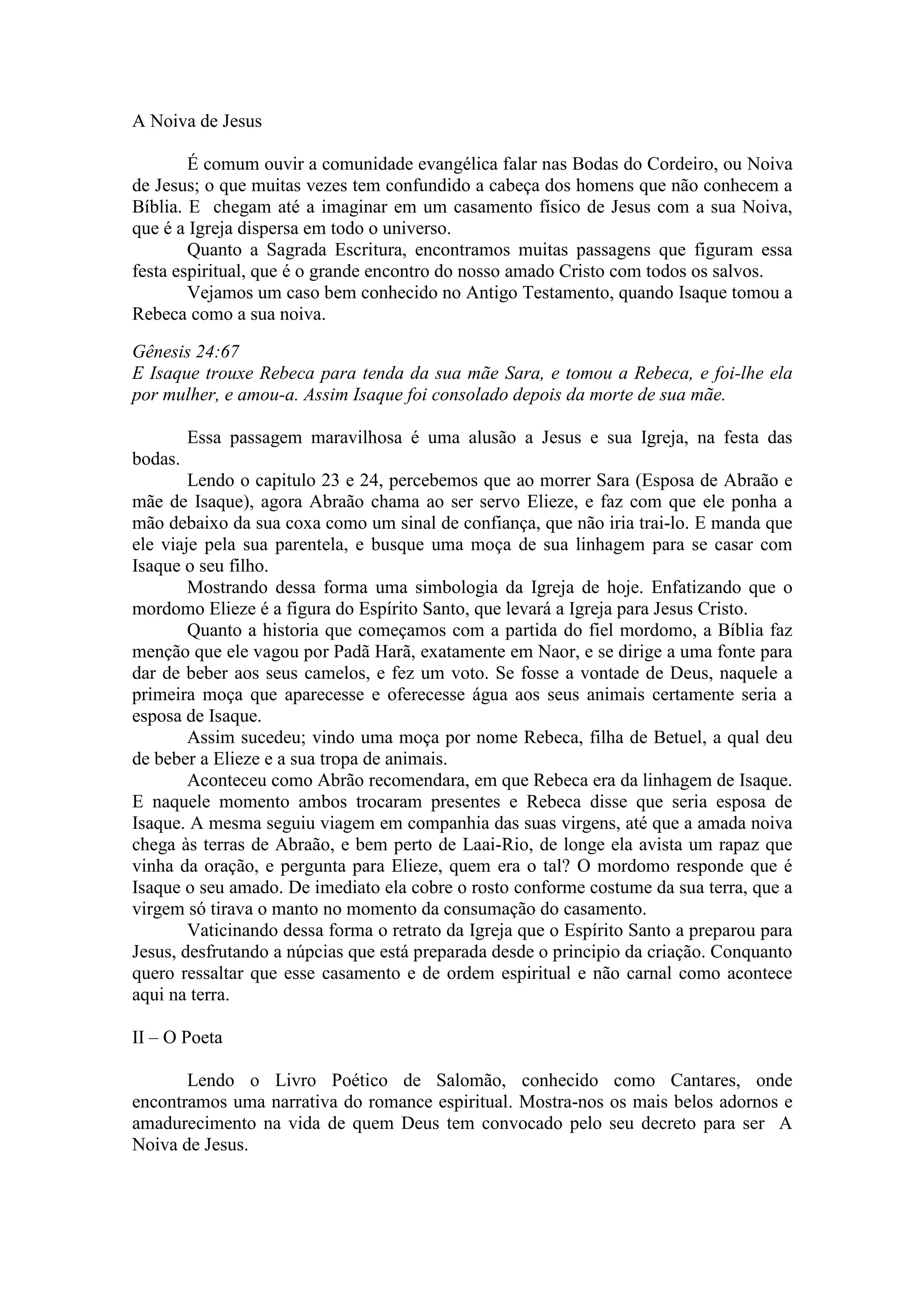 O documento descreve a Noiva de Jesus como sendo a Igreja, usando exemplos bíblicos como Isaque e Rebeca e as dez virgens para ilustrar a relação espiritual entre Cristo e Sua noiva. Ele também discute o amadurecimento e fidelidade requeridos para ser a noiva de Cristo.