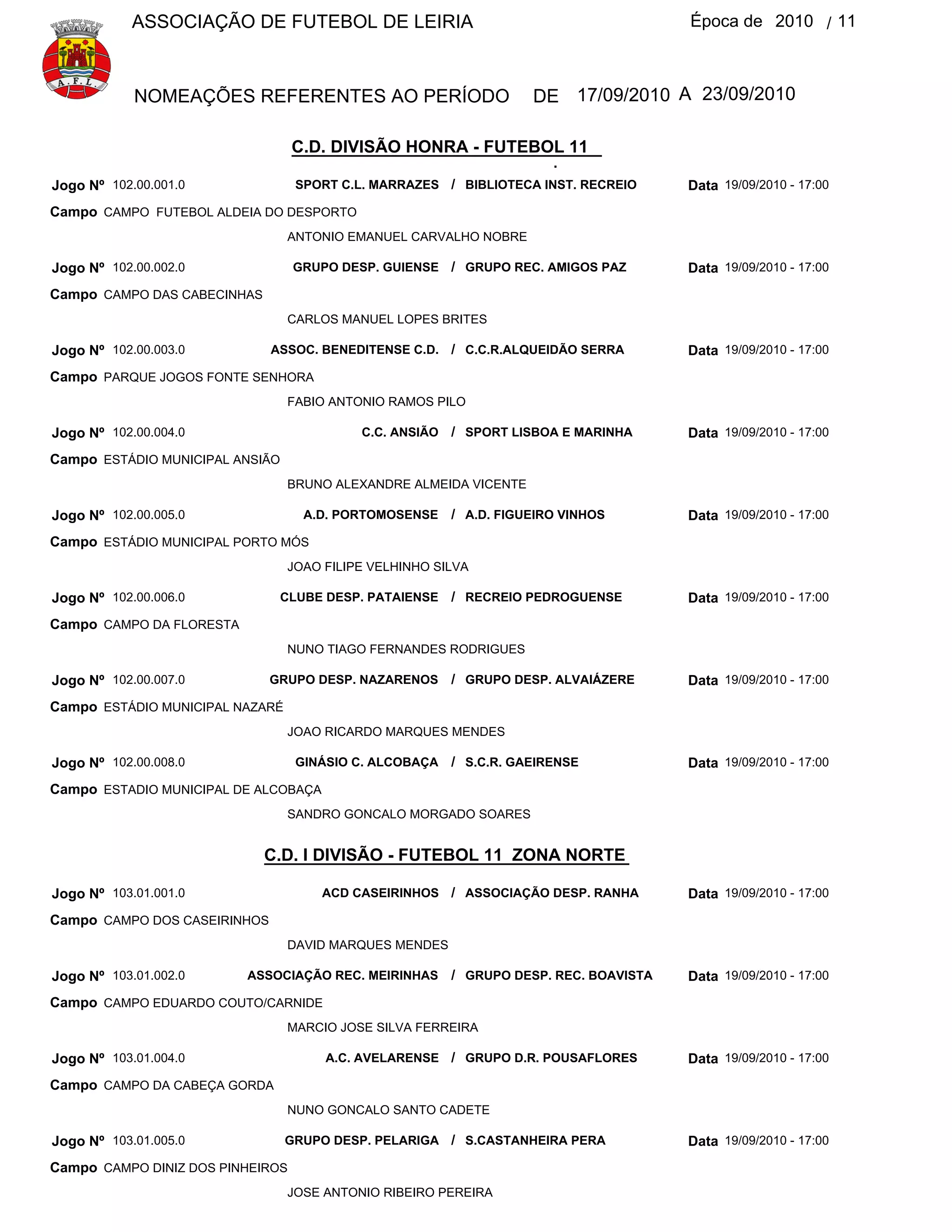 Este documento lista as nomeações de árbitros para jogos da Associação de Futebol de Leiria entre 17 e 23 de setembro de 2010. São listados jogos da Divisão de Honra e da 1a Divisão - Zona Norte, com os campos, datas e nomes dos árbitros designados para cada jogo.