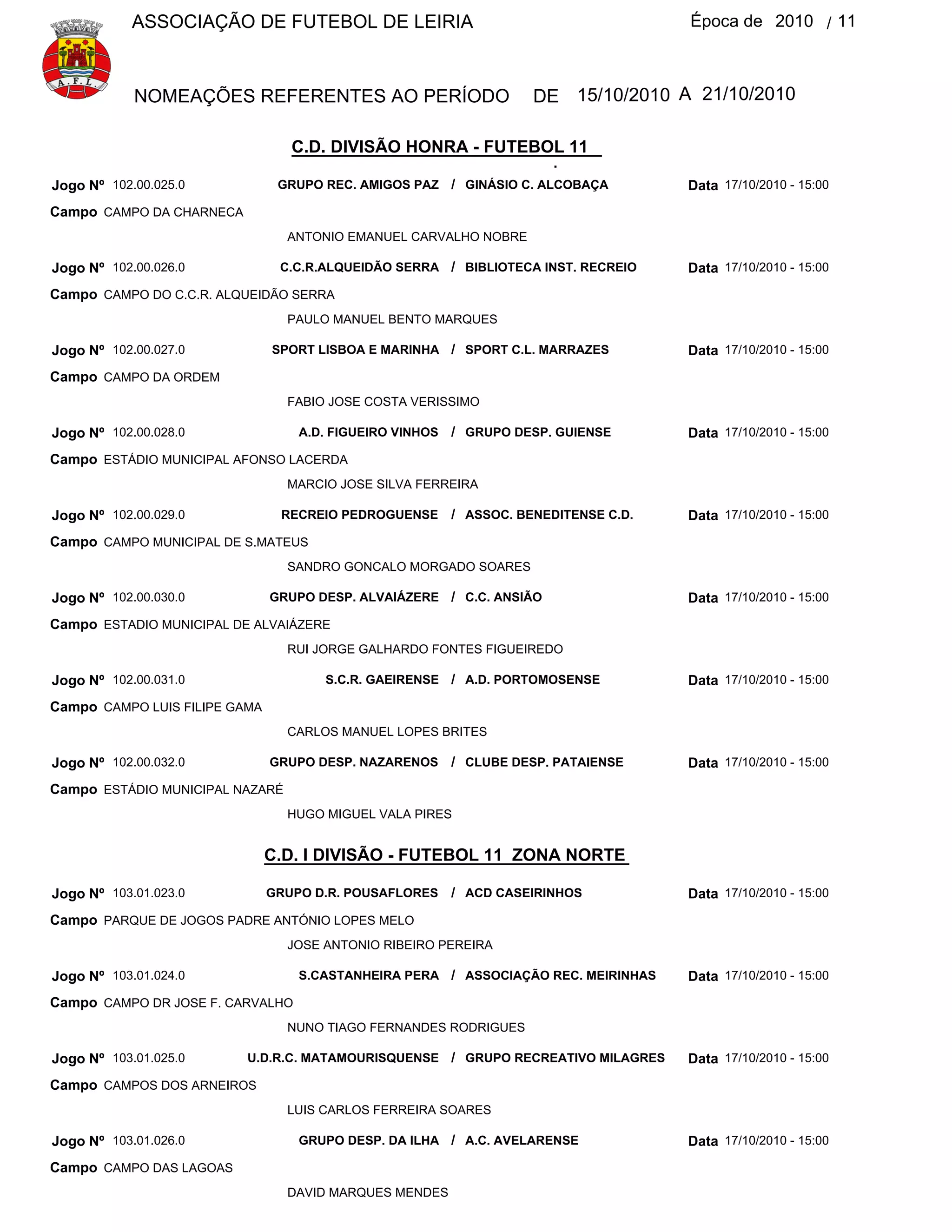 1) O documento lista nomeações de árbitros para vários jogos de futebol entre clubes da região de Leiria entre os dias 16 e 17 de outubro de 2010.