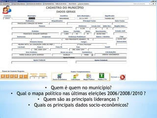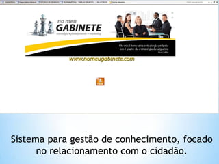 Este documento descreve um sistema de gestão de conhecimento focado no relacionamento com cidadãos, que fornece informações sobre políticos, eleições, lideranças e dados socioeconômicos de 184 municípios, além de ferramentas para cadastro de dados demográficos, solicitações, pesquisas e comunicação com eleitores.
