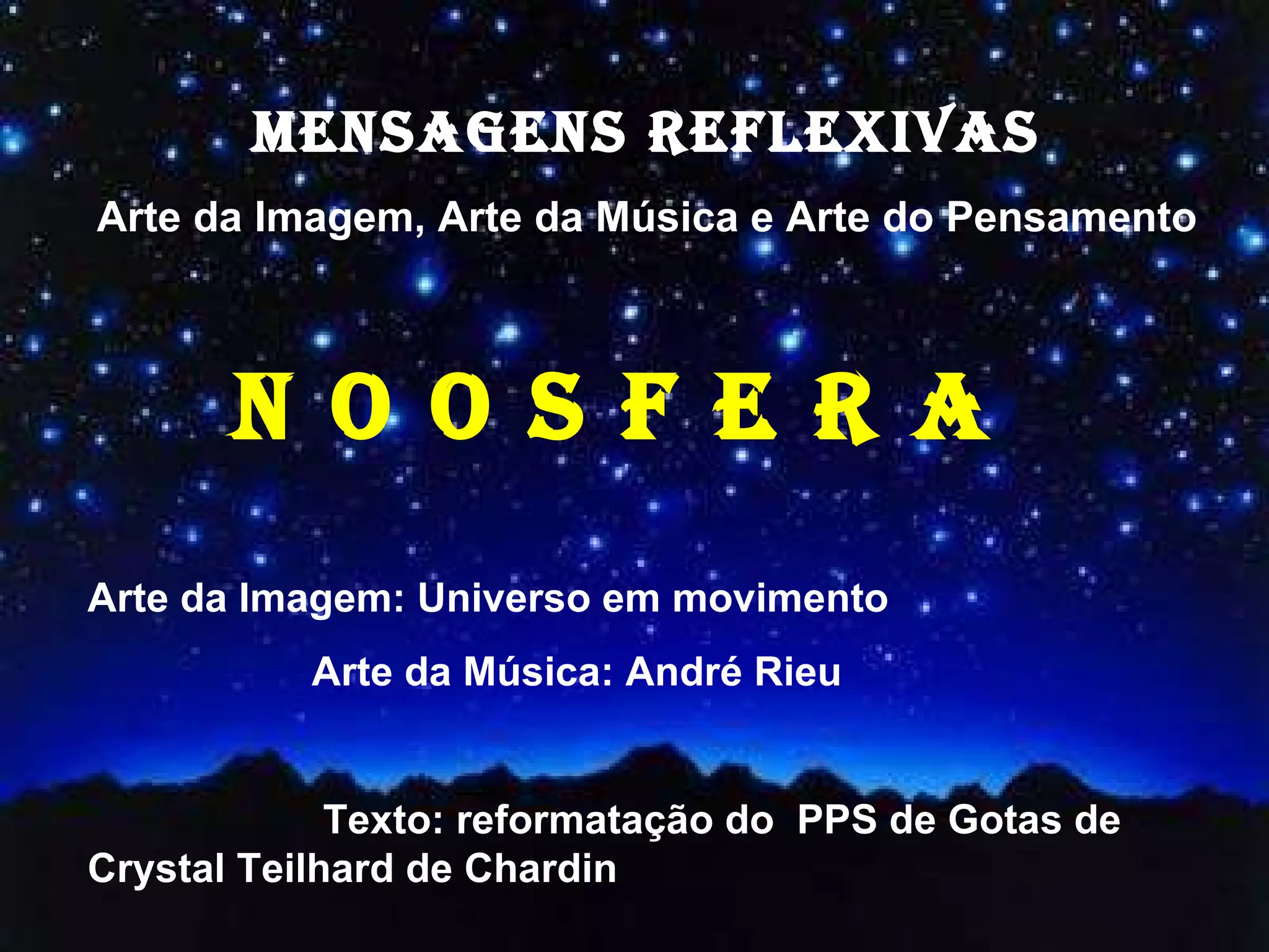 O documento discute a noosfera, definida como o produto coletivo de milhares de anos de pensamento humano. A noosfera representa o desenvolvimento do pensamento e das ideias, assim como a geosfera representa a matéria inanimada e a biosfera representa a vida biológica. O documento sugere que a humanidade precisa encontrar paz interior em vez de apenas buscar paz externa, e que existe um motor evolutivo consciente guiando a humanidade.
