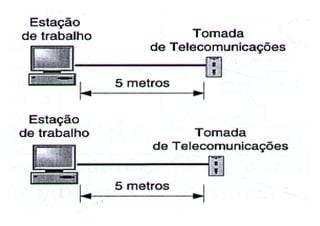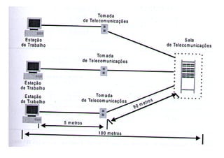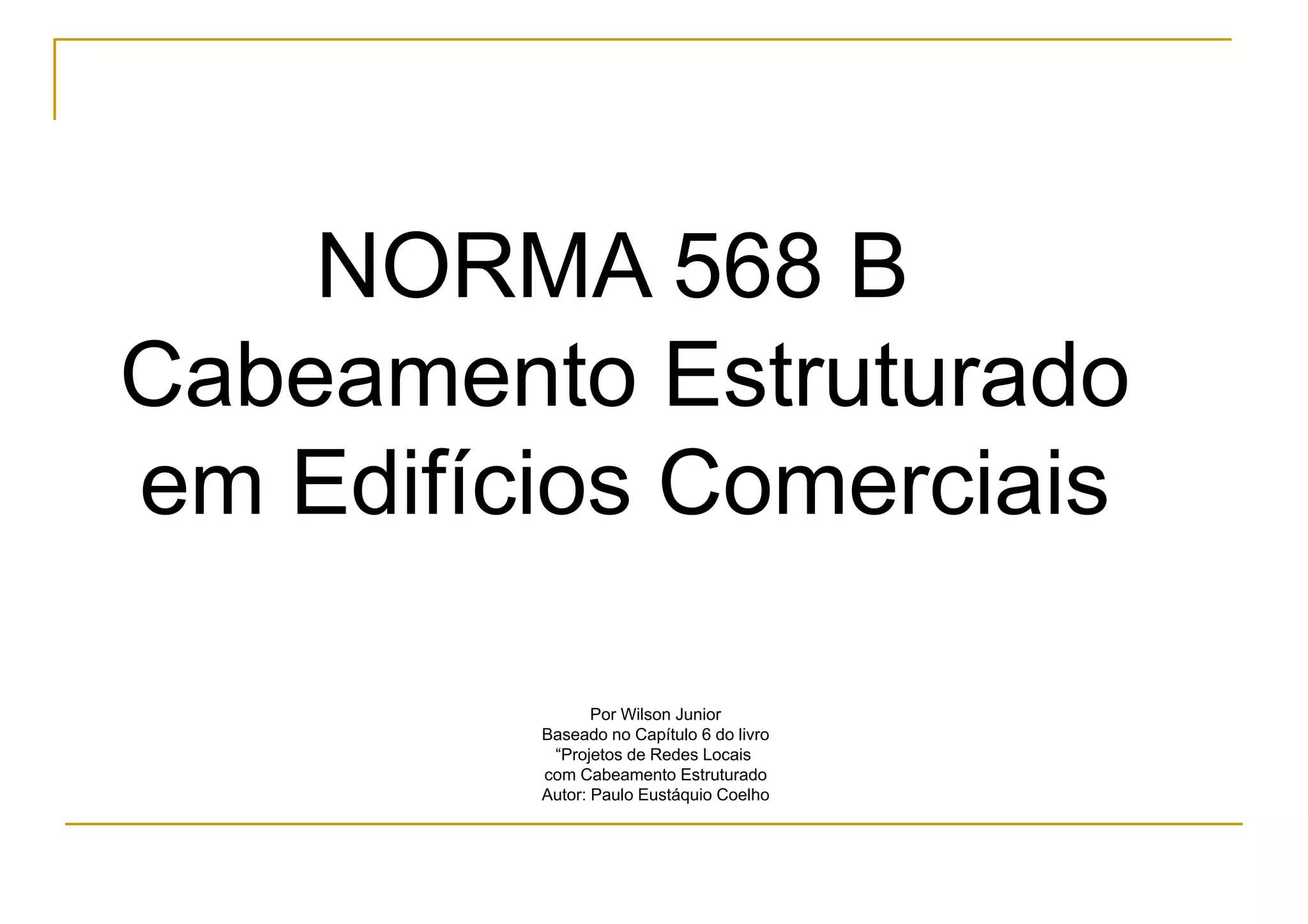 O documento descreve os principais aspectos da norma ANSI/EIA/TIA 568B sobre cabeamento estruturado em edifícios comerciais, incluindo seus sete subsistemas (acesso ao prédio, sala de equipamentos, cabeamento vertical, salas de telecomunicações, cabeamento horizontal, área de trabalho e administração) e requisitos para cada um.