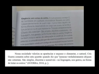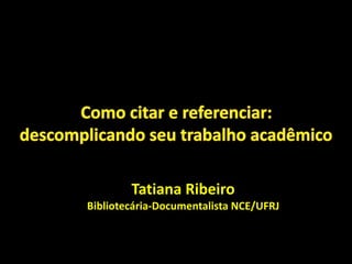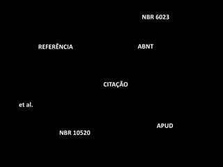 O documento resume os principais tipos de citações em trabalhos acadêmicos: citação direta, indireta e de citação. Explica que a citação direta envolve a transcrição textual da fonte, a indireta se baseia na obra e a de citação cita um texto no qual não se teve acesso direto. Também apresenta as normas da ABNT para referências bibliográficas.