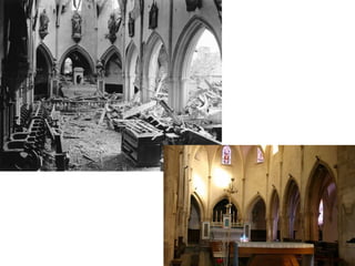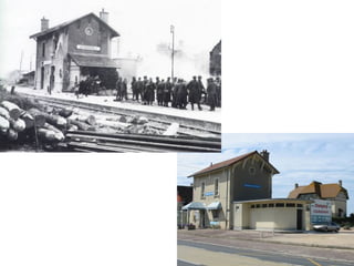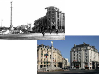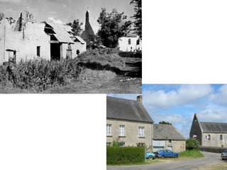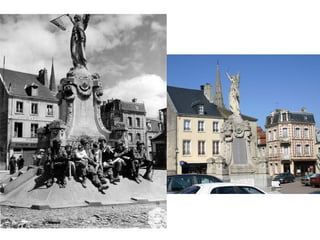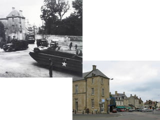 O documento apresenta uma seleção de fotos comparando a Normandia em 1944 após o desembarque aliado no Dia D com fotos atuais dos mesmos locais, mostrando as mudanças ao longo do tempo.