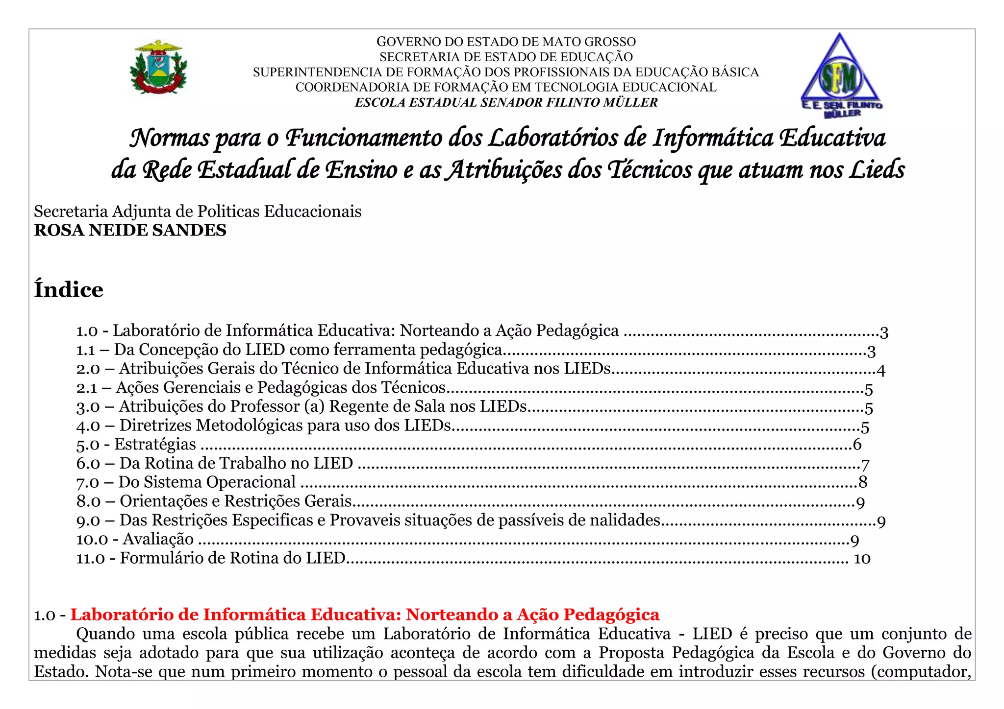 Este documento fornece diretrizes e normas para o funcionamento dos Laboratórios de Informática Educacional (LIEDs) nas escolas estaduais de Mato Grosso. Ele define as atribuições dos técnicos de informática e professores nesses laboratórios, orientações pedagógicas e metodológicas para o uso das tecnologias, e regras de segurança e manutenção dos equipamentos.