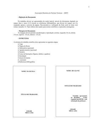 Este documento fornece instruções sobre a formatação e estrutura de trabalhos acadêmicos de acordo com as normas da ABNT. Ele descreve como os trabalhos devem ser digitados, quais margens devem ter, e a estrutura básica que deve incluir seções como introdução, desenvolvimento, conclusão e referências bibliográficas.
