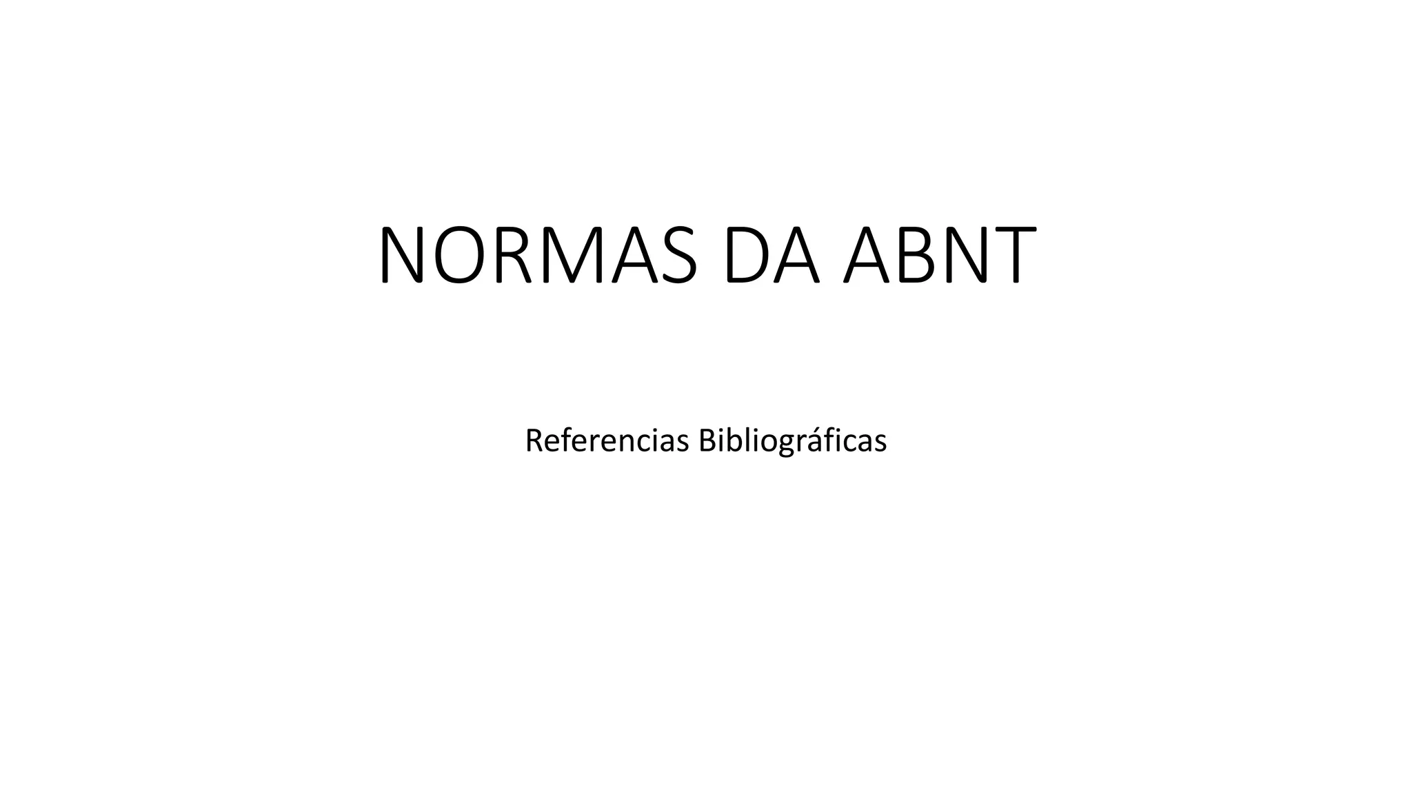 O documento apresenta normas da ABNT para referências bibliográficas, definindo que a lista deve estar alinhada à esquerda, numerada e com a palavra "Referência" centralizada. Também define os tipos de referências como livros, teses, periódicos e eletrônicos.