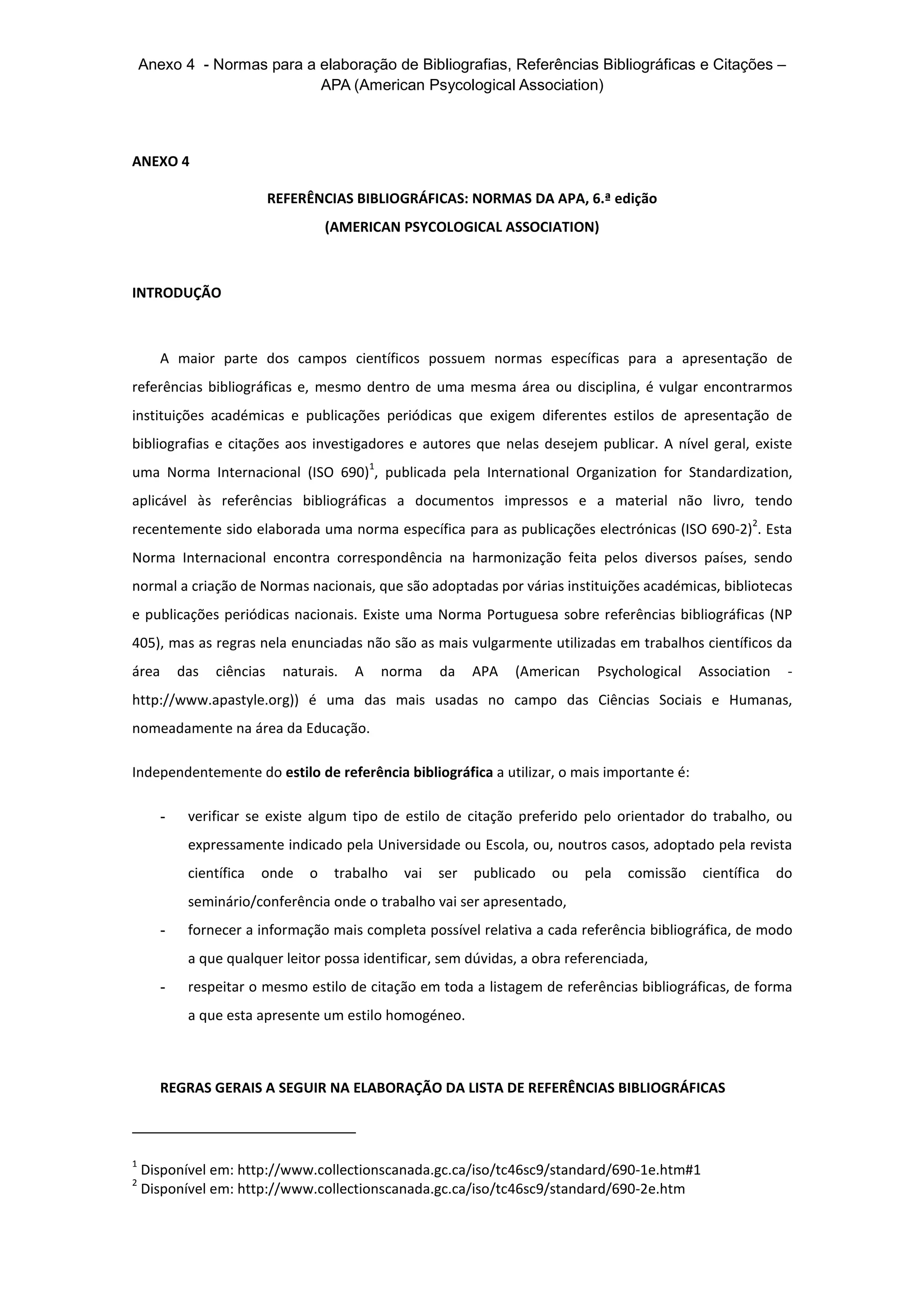 [1] O documento apresenta as normas da APA (American Psychological Association) para elaboração de bibliografias, referências bibliográficas e citações. [2] Discutem-se regras gerais como ordem alfabética dos autores, tipo e ordem de informação para diferentes tipos de publicações. [3] Fornecem-se exemplos de referências para livros, artigos, documentos online e outros formatos.