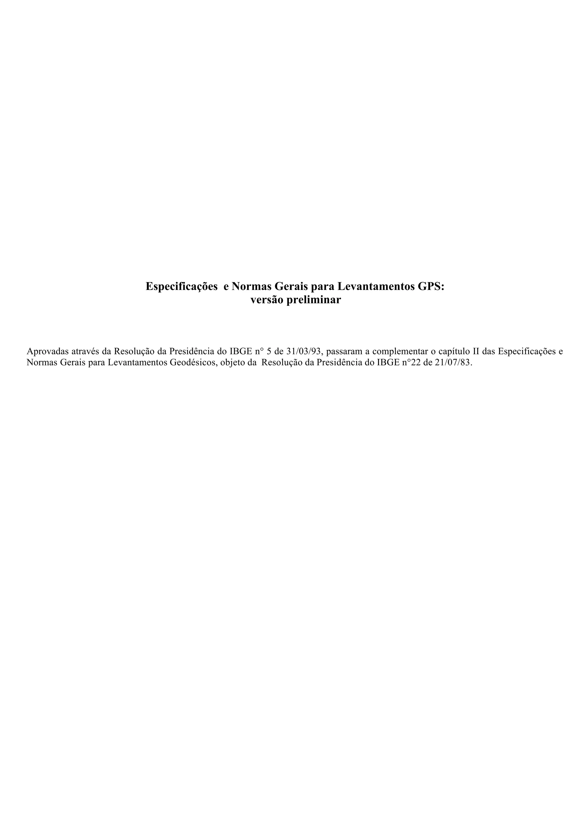 Este documento apresenta especificações e normas gerais para levantamentos GPS no Brasil. Detalha os três segmentos do sistema GPS (espacial, de controle e do usuário), as características dos sinais transmitidos pelos satélites e os tipos de receptores GPS. Tem como objetivo fornecer elementos básicos para serviços de posicionamento que utilizam métodos associados ao GPS.