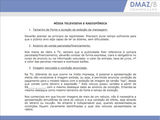 O documento estabelece novas normas para publicidade de veículos, incluindo tamanho mínimo de fontes, limites de caracteres por linha, proibições de cores de fonte e imagens incorretas, e exigindo valores de entrada e parcelas nos anúncios.