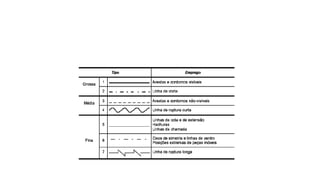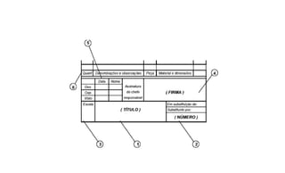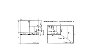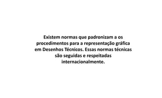 O documento descreve as normas para desenho técnico no Brasil, estabelecidas pela Associação Brasileira de Normas Técnicas (ABNT). A ABNT padroniza procedimentos gráficos em desenhos seguindo normas internacionais da Organização Internacional de Normalização (ISO), visando a igualdade de padrões entre países. Algumas normas regulamentam aspectos como legenda, linhas, escalas e cotagem em desenhos técnicos.
