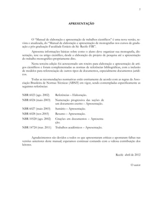 1. Este manual apresenta orientações sobre a elaboração e apresentação de trabalhos científicos como monografias e artigos, abordando sua estrutura, formatação e normas para citações e referências bibliográficas de acordo com as normas da ABNT.