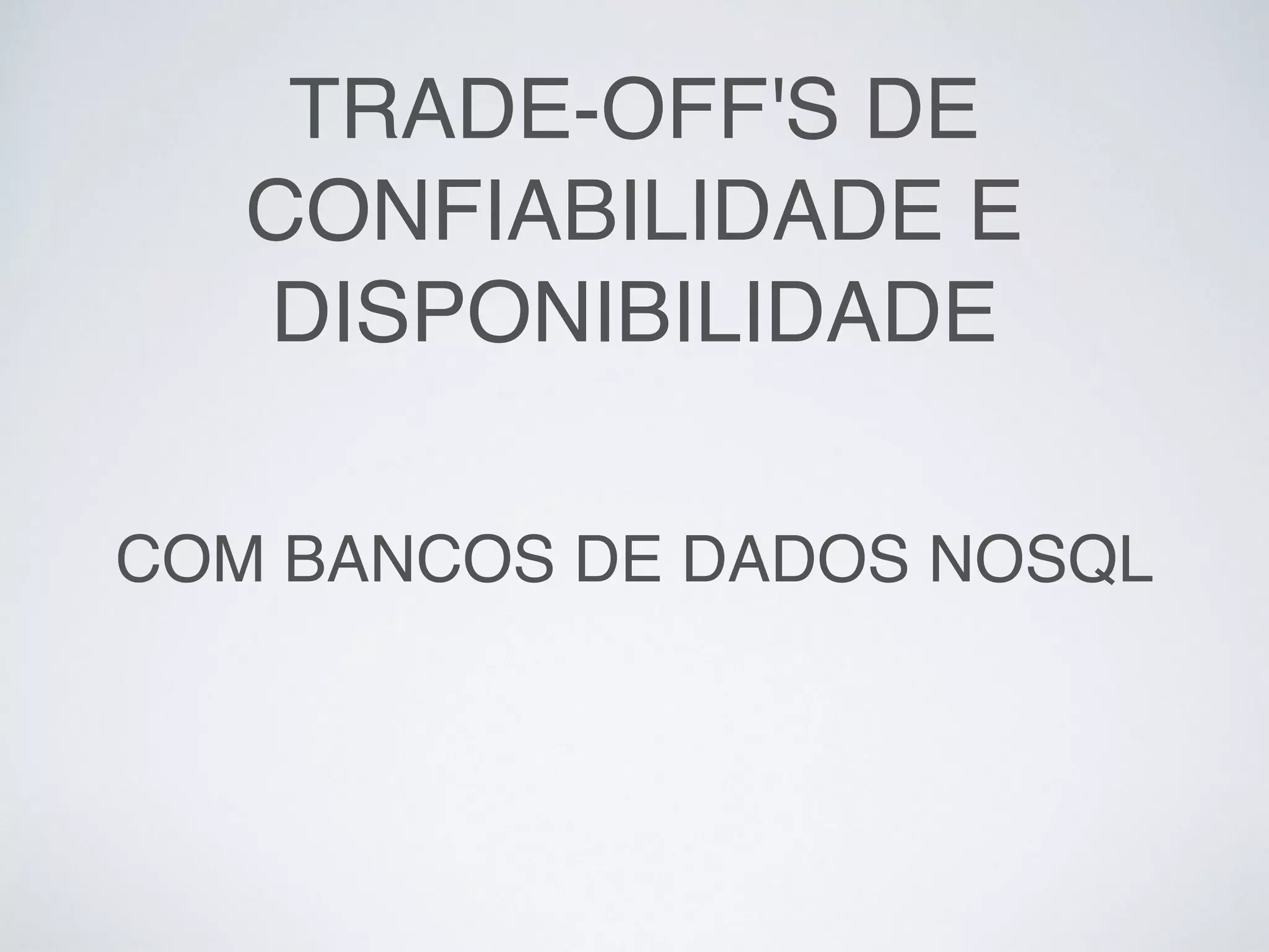 O documento discute os trade-offs entre confiabilidade e disponibilidade em bancos de dados NoSQL, abordando tópicos como modelos de dados, fragmentação, replicação e problemas de consistência em ambientes distribuídos.