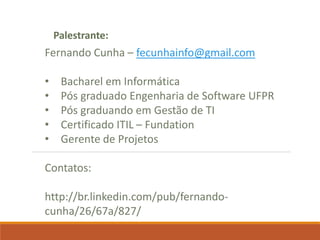 O documento apresenta uma introdução sobre Fernando Cunha e sua experiência profissional. Em seguida, fornece uma classificação dos principais tipos de bancos de dados NoSQL, exemplos e quais empresas os utilizam, abordando questões como suporte a queries e linguagens. Por fim, discute sobre as oportunidades do mercado NoSQL.