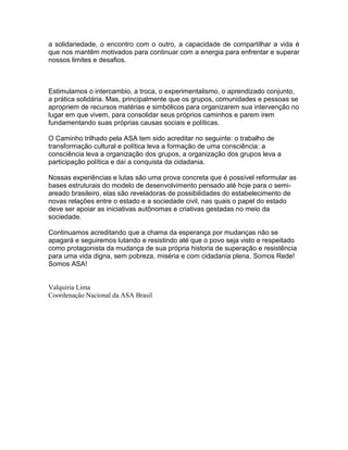 A Articulação Semiárido nasceu para fortalecer a sociedade civil na construção de processos participativos para o desenvolvimento sustentável do semiárido brasileiro, referenciados em valores culturais e justiça social. A rede é diversa e democrática, promovendo o diálogo, a troca de experiências e a valorização da cultura local. Sua missão é empoderar as comunidades locais para que sejam protagonistas na transformação de sua própria história rumo a uma vida digna.