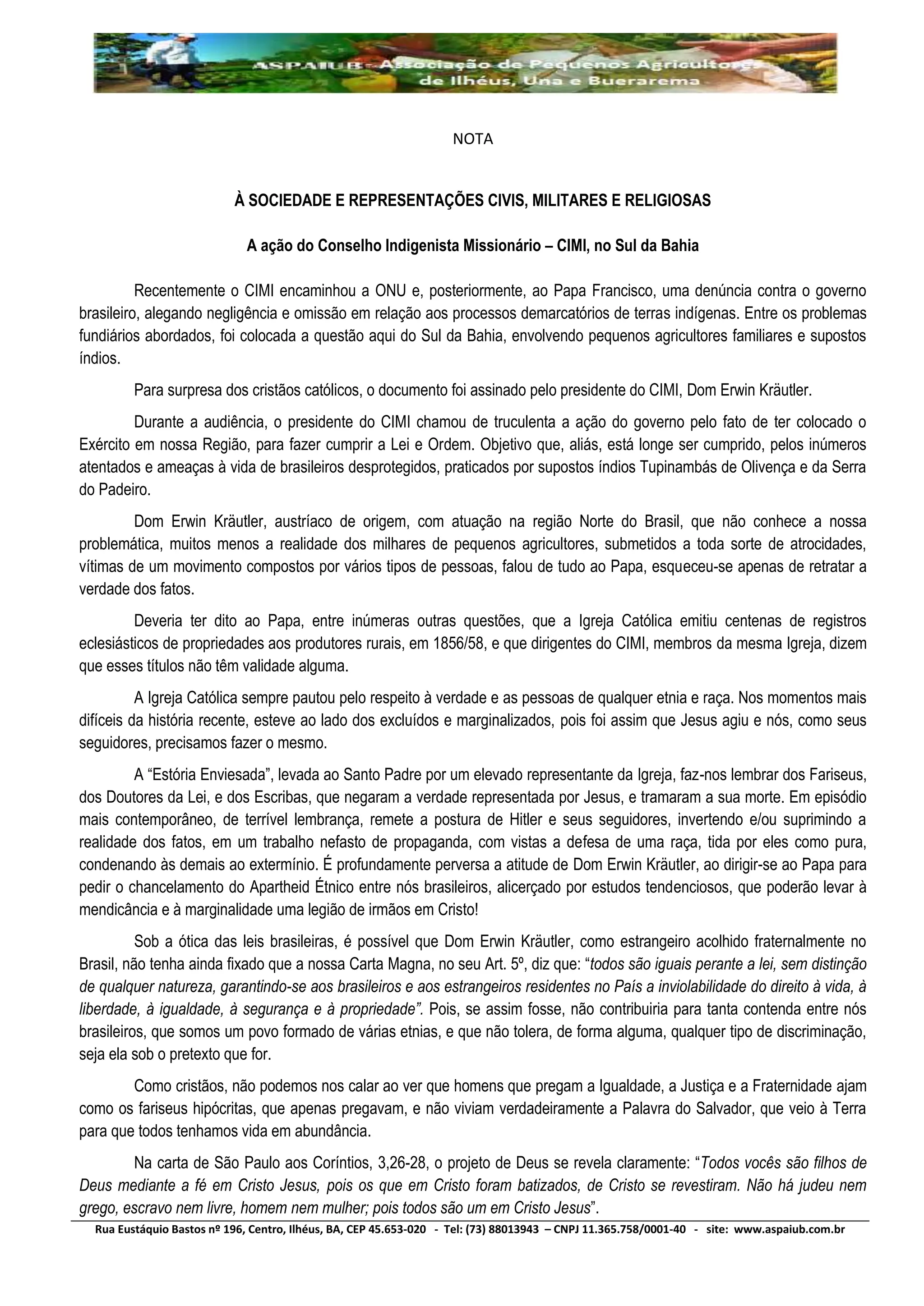 Dom Erwin Kräutler, presidente do CIMI, apresentou uma denúncia à ONU e ao Papa Francisco sobre a situação fundiária no sul da Bahia, alegando negligência do governo brasileiro. A ASPAIUB critica fortemente a denúncia, afirmando que ela distorce a realidade e omite fatos importantes, como invasões de propriedades e violência contra agricultores pela suposta etnia indígena Tupinambá. A ASPAIUB pede que a Igreja e o governo garantam a segurança dos agricultores e a devolução