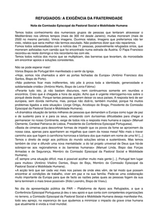 2) Os bispos portugueses expressaram que a Igreja não pode mais permanecer indiferente e que é hora de ação para apoiar os refugiados.
