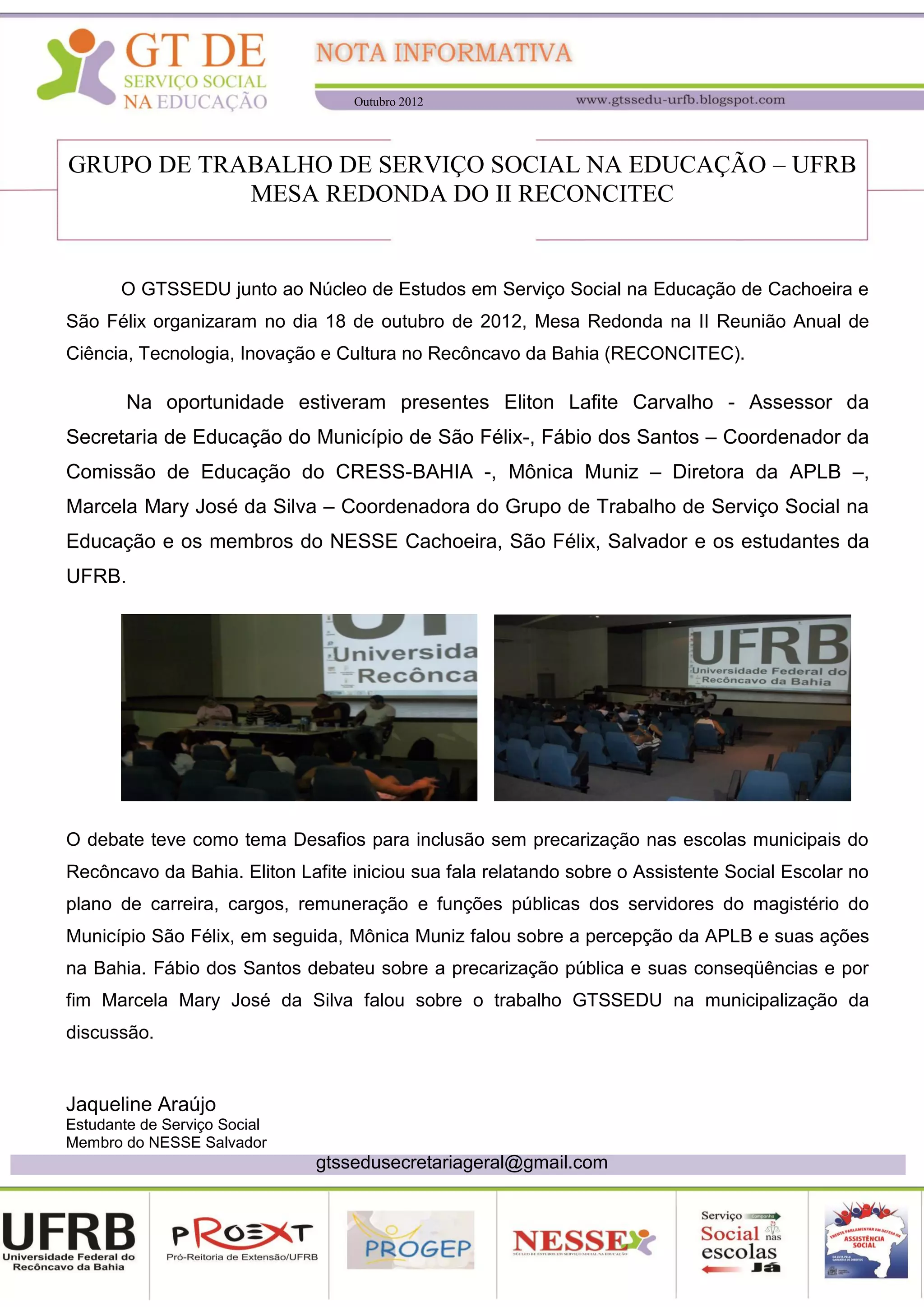 A mesa redonda discutiu os desafios para inclusão sem precarização nas escolas municipais do Recôncavo da Bahia. Representantes de secretarias municipais, do CRESS-BA e da APLB debateram sobre o plano de carreira dos assistentes sociais escolares em São Félix e os efeitos da precarização do serviço público. O GTSSEDU apresentou seu trabalho na municipalização do debate.