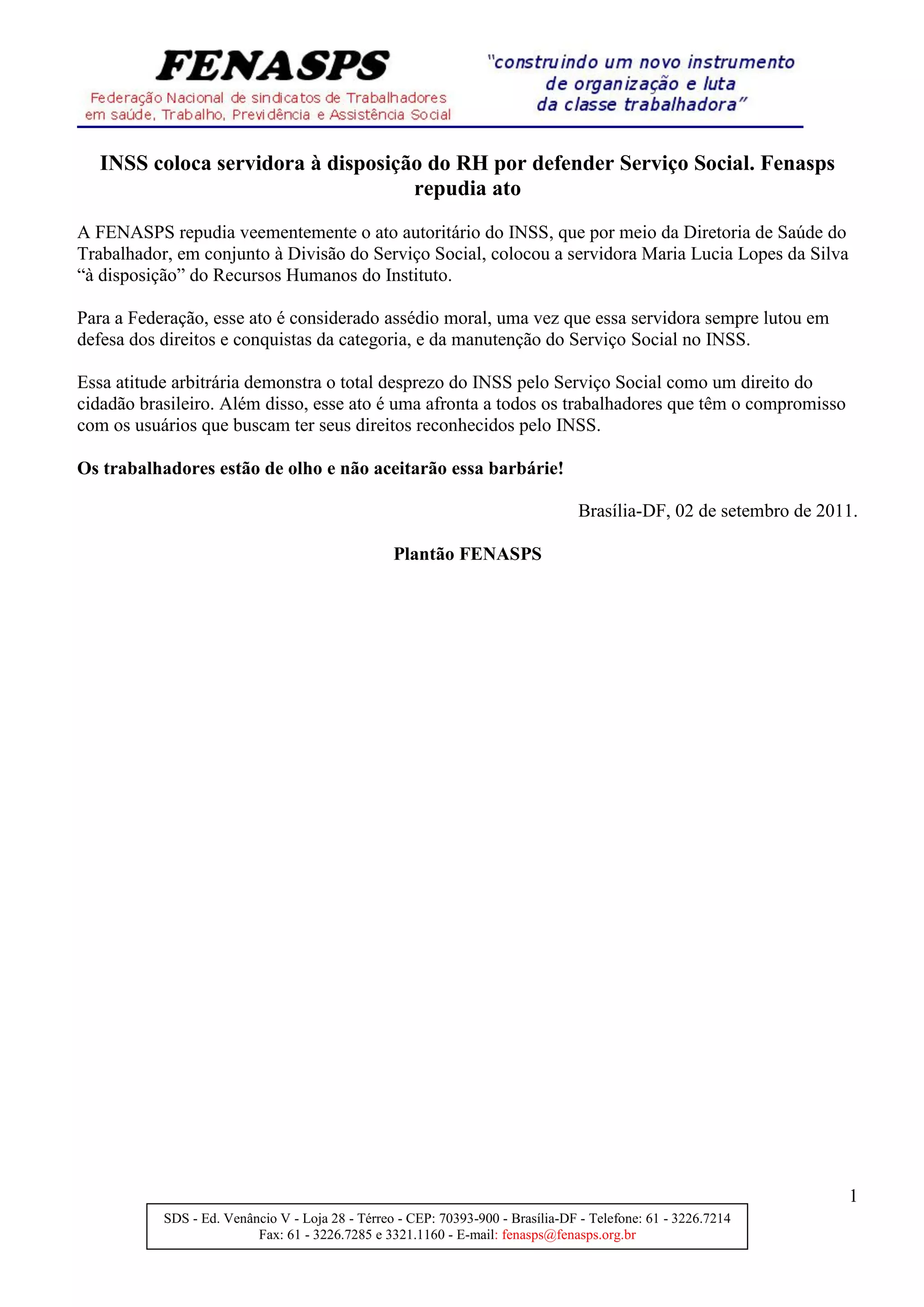 A FENASPS repudiou o INSS por colocar uma servidora "à disposição" do RH após ela defender o Serviço Social. Isso é assédio moral segundo a federação, pois a servidora sempre lutou pelos direitos dos trabalhadores. O ato também demonstra desprezo pelo Serviço Social como direito dos cidadãos brasileiros.