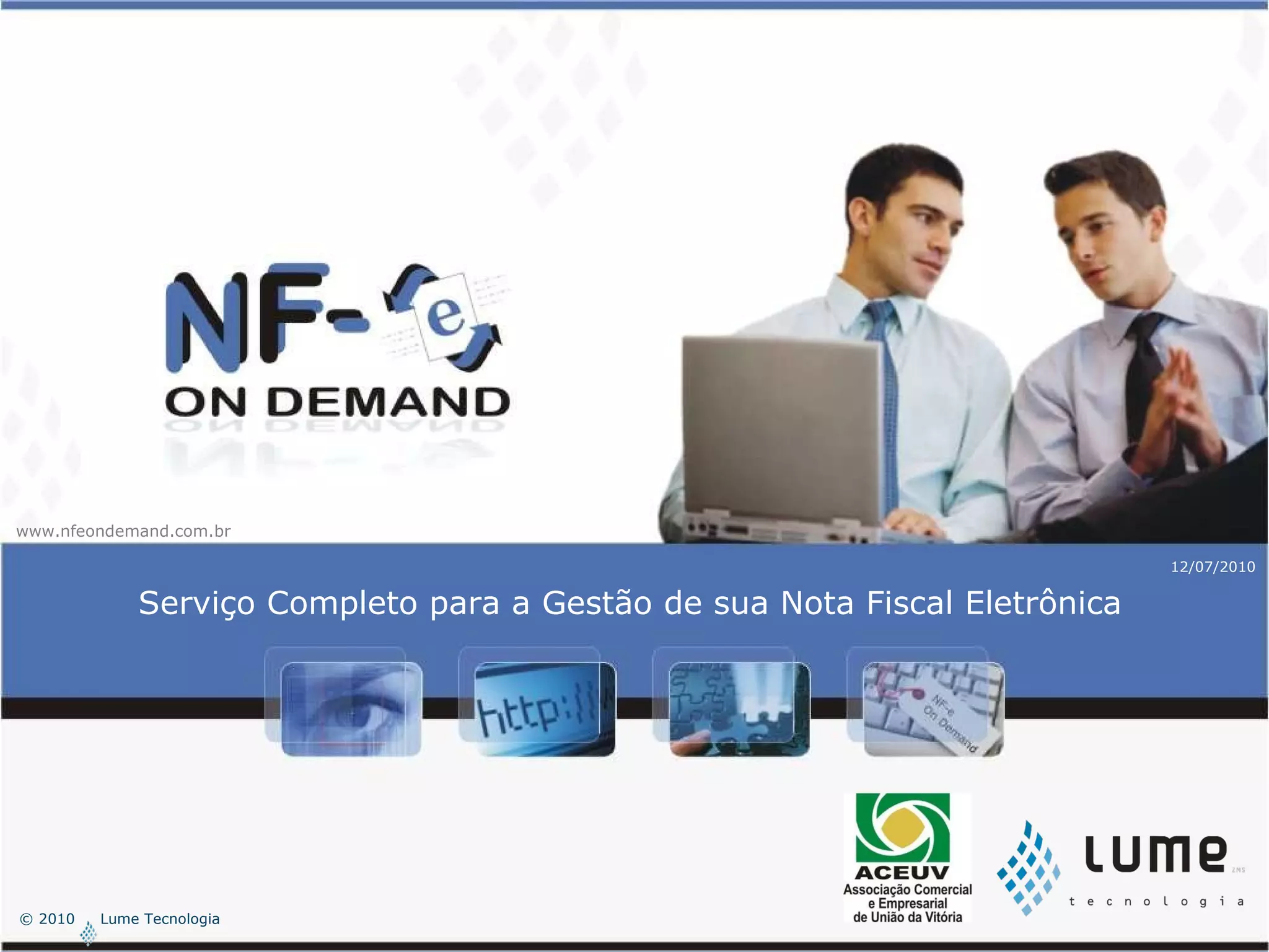 Este documento descreve os serviços de emissão de notas fiscais eletrônicas oferecidos pela empresa Lume Tecnologia através de seu sistema "NF-e On Demand". O sistema oferece a emissão de NF-e de forma online e sob demanda, sem a necessidade de investimentos em hardware ou software, oferecendo benefícios como redução de custos e agilidade. O sistema foi desenvolvido em parceria com a Associação Comercial e Empresarial de União da Vitória para atender as necessidades dos associados.