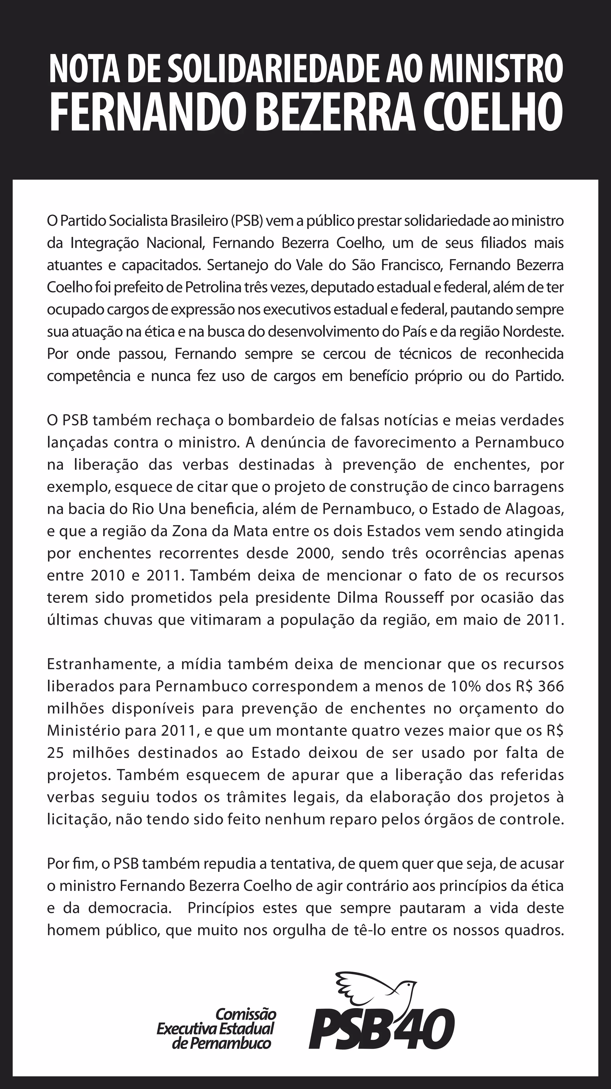 O PSB presta solidariedade ao ministro Fernando Bezerra Coelho contra acusações falsas. O partido rejeita as alegações de favorecimento a Pernambuco na liberação de verbas para enchentes e afirma que os recursos seguiram os trâmites legais. O PSB repudia tentativas de acusar o ministro de agir contra a ética.