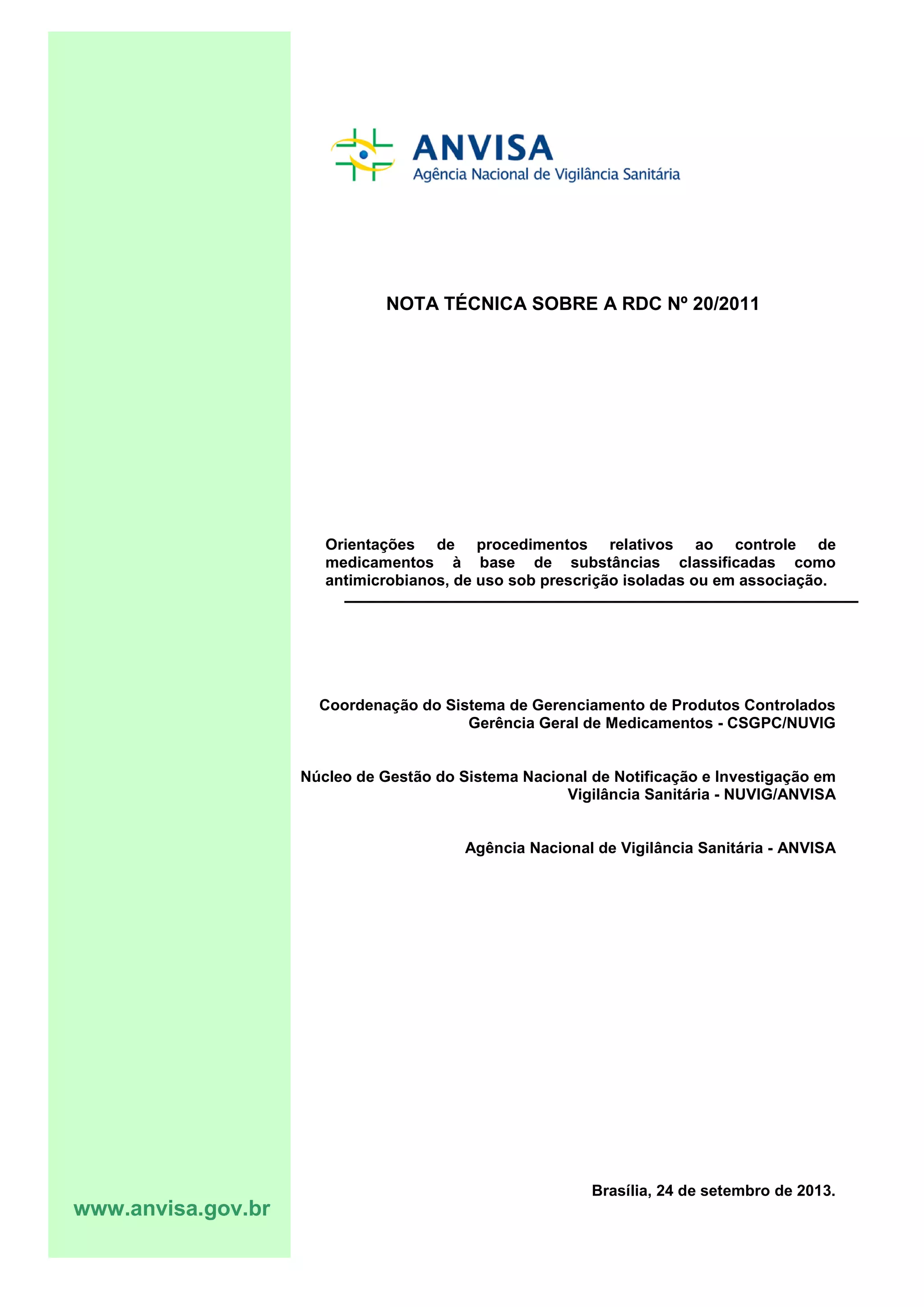 A nota técnica aborda orientações sobre a dispensação e controle de medicamentos antimicrobianos conforme a RDC nº 20/2011, incluindo diretrizes sobre a prescrição, dispensação e escrituração eletrônica no SNGPC. Ela determina requisitos sobre informações na receita, permissões para dispensação parcial, e regras para medicamentos de uso veterinário e tópicos contendo neomicina. Além disso, menciona que a ANVISA pode atualizar a norma conforme necessário e trata de dificuldades no acesso ao sistema SNGPC.