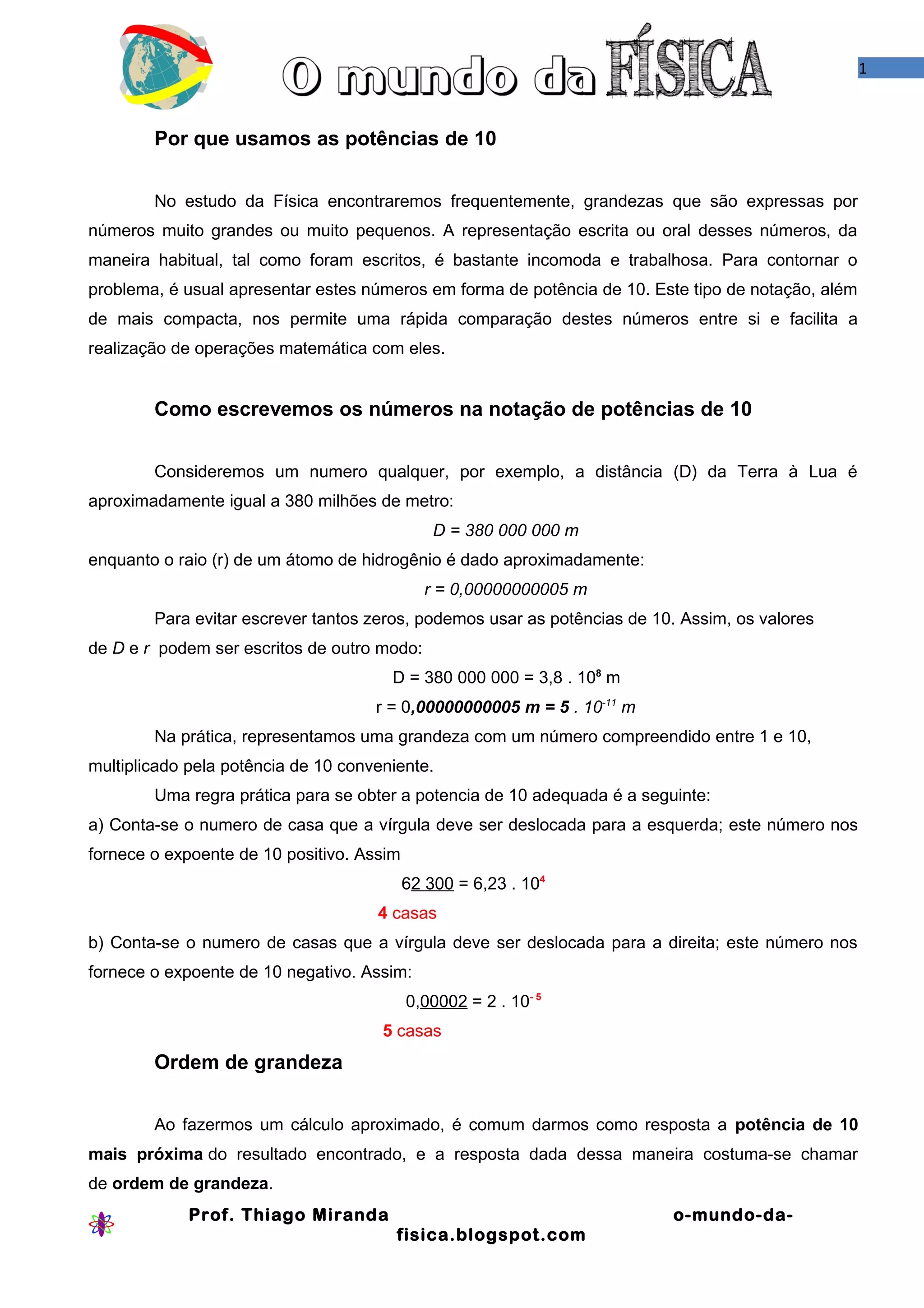 O documento explica porque usamos notação científica para números muito grandes ou pequenos, como a distância da Terra à Lua em 3,8 x 108 m. Ele também ensina como escrever números usando potências de 10 e como calcular a ordem de grandeza de um número.