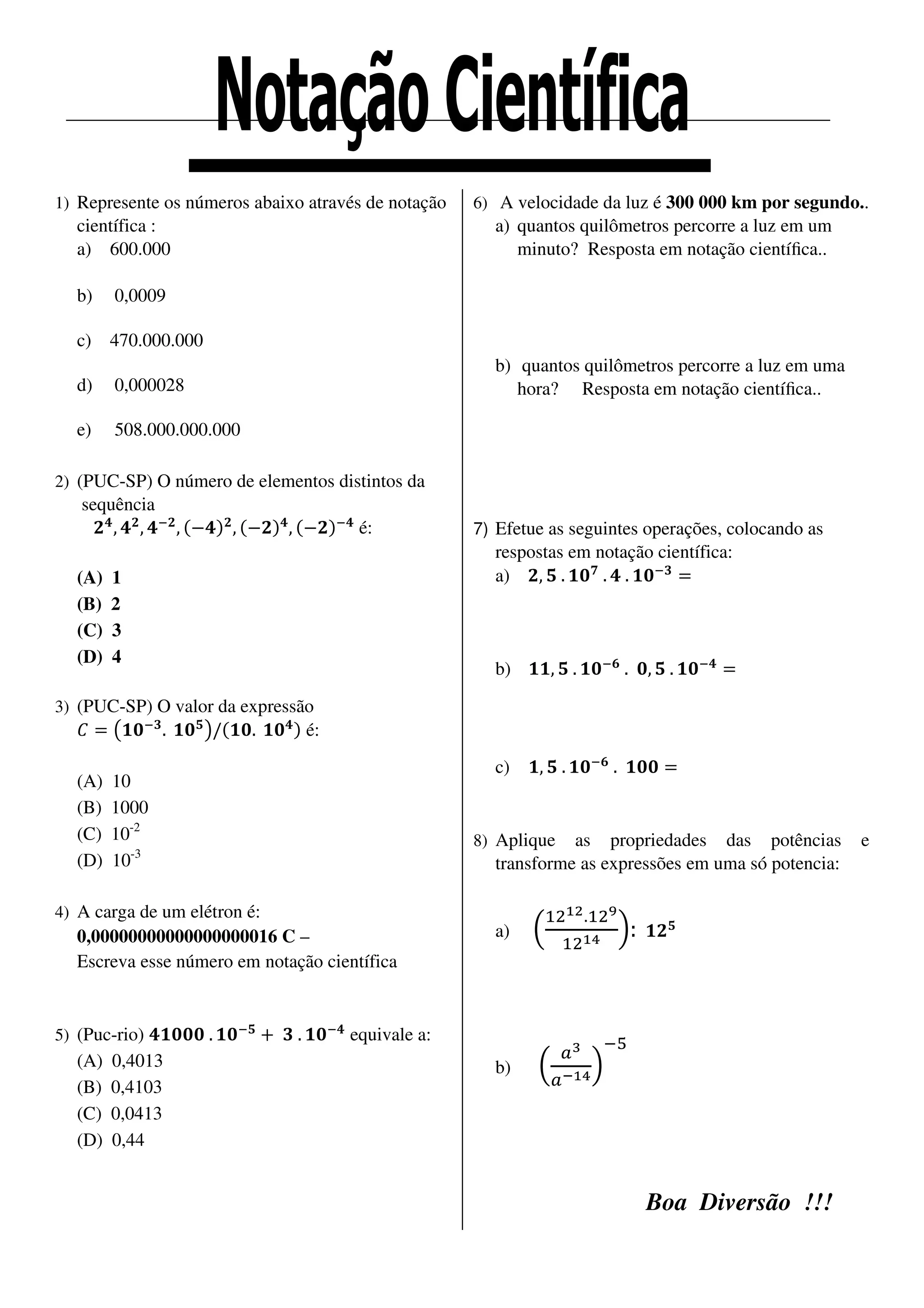 Este documento apresenta exercícios sobre representação de números em notação científica e operações com potências. Ele inclui questões sobre (1) escrever números em notação científica, (2) identificar o número de elementos distintos em uma sequência, (3) calcular o valor de uma expressão, (4) escrever a carga de um elétron em notação científica, e (5) realizar operações como soma, multiplicação e divisão com respostas em notação científica.