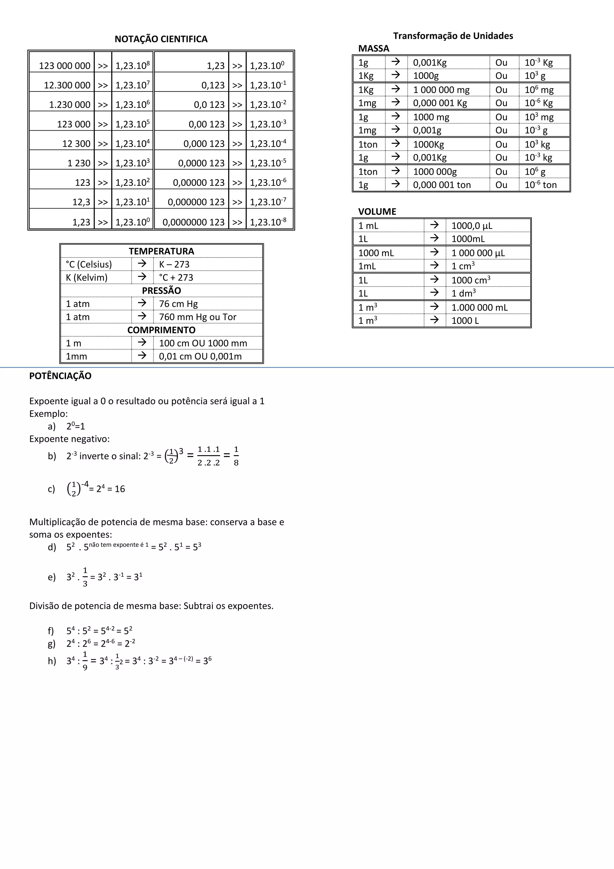 O documento apresenta diferentes notações científicas para números, incluindo a transformação entre unidades de massa, volume, temperatura e pressão. Ele também explica operações com potências como multiplicação, divisão e transformação de expoentes negativos.