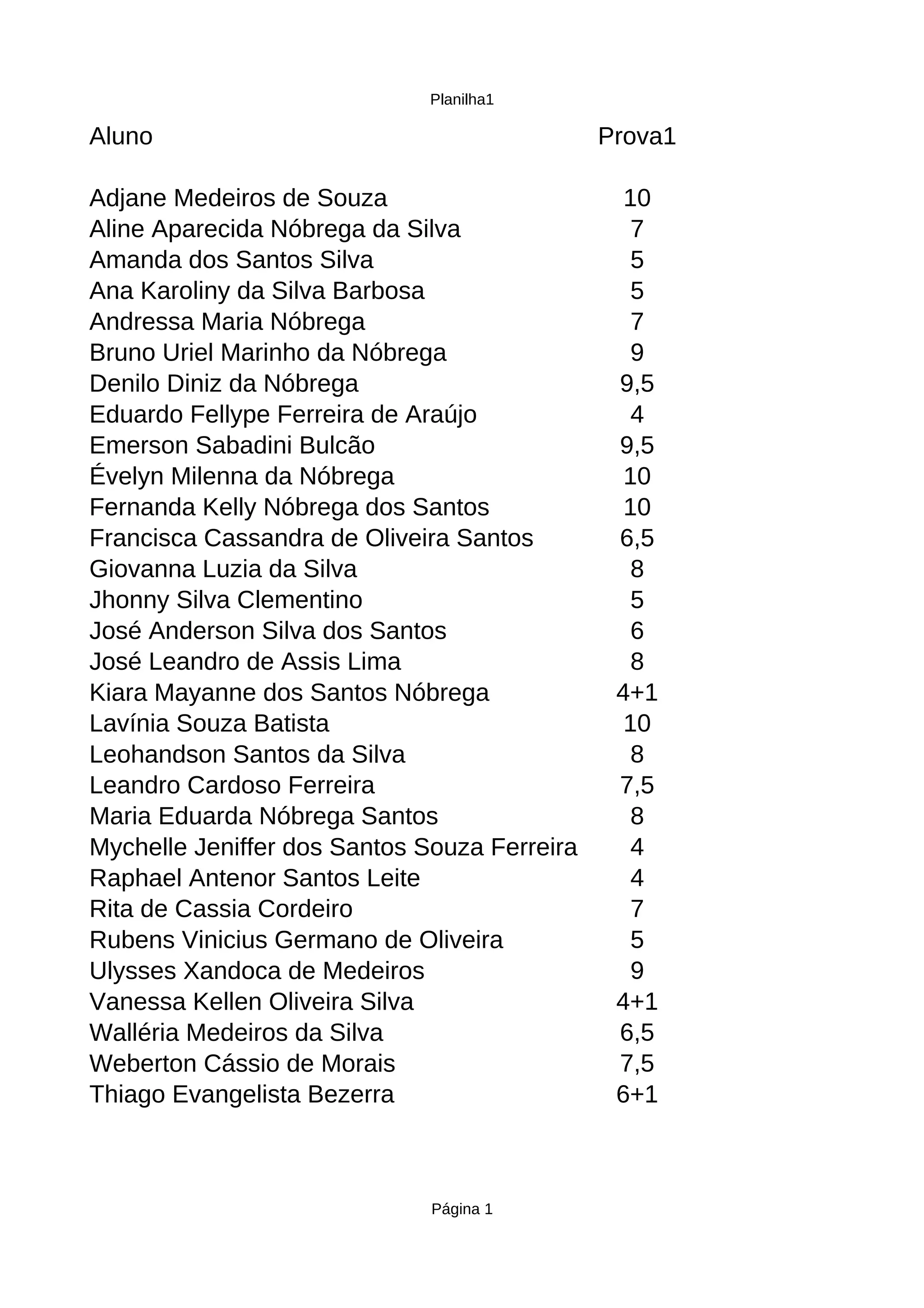 Este documento é uma planilha com os resultados de alunos em três provas e um trabalho. A planilha lista o nome dos alunos e suas notas individuais em Prova1, Prova2 de Recuperação e Trabalho.