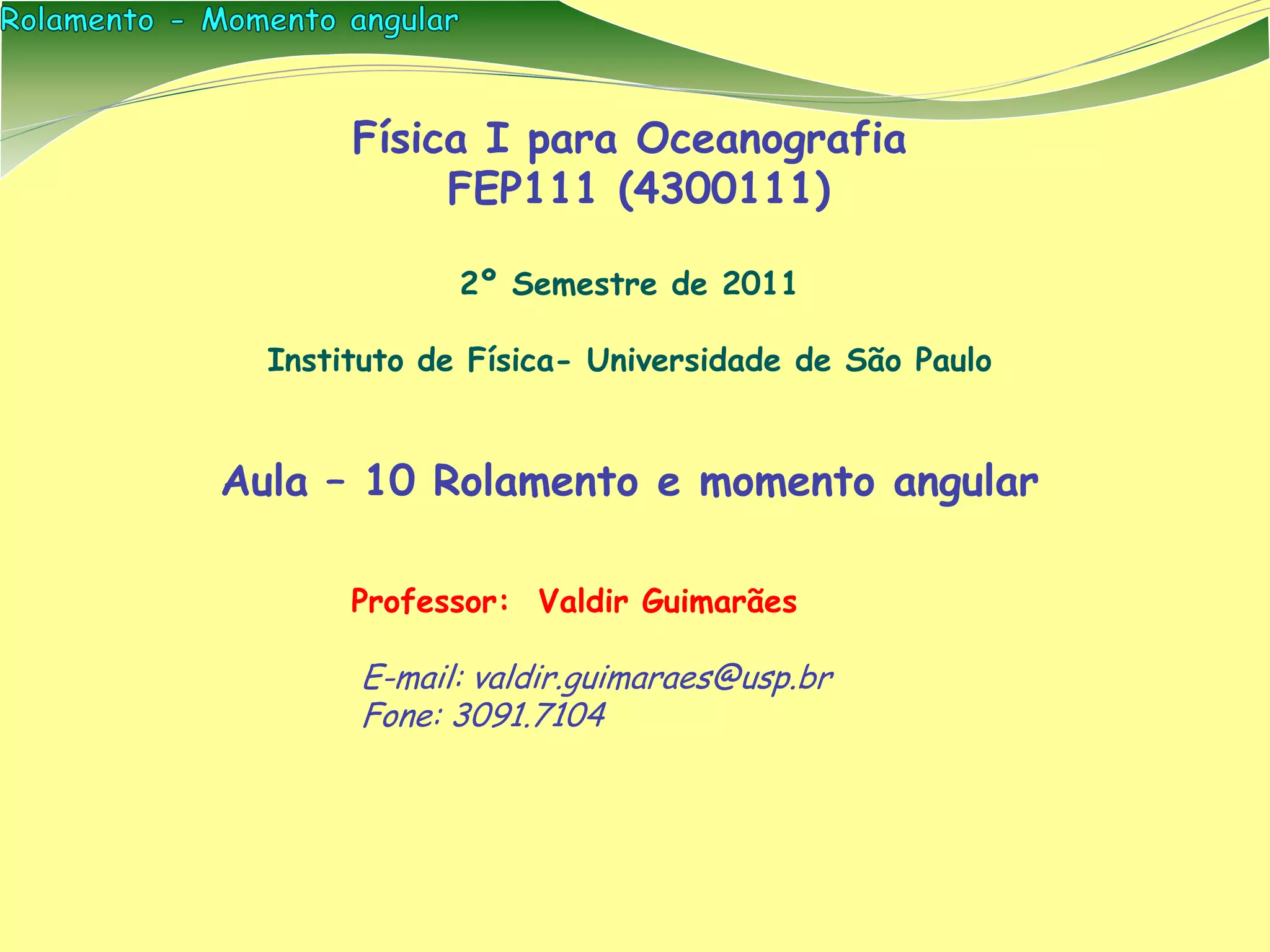 [1] O documento apresenta conceitos de física sobre rolamento e momento angular, que descrevem o movimento de objetos rolando sem deslizar. [2] É introduzido o conceito de momento angular como análogo à quantidade de movimento para rotações, e discutidas suas propriedades vetoriais. [3] São mostrados exemplos de cálculos envolvendo rolamento, incluindo de uma bola em uma rampa e de objetos rolando sem deslizar.