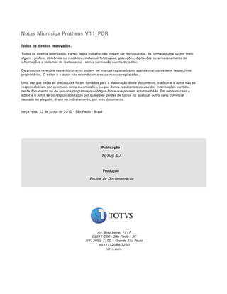 Este documento apresenta as notas de lançamento da versão 11 do sistema Microsiga Protheus. Ele descreve as principais novidades implementadas nos módulos de Framework, Business Intelligence, Controladoria, Jurídico, Saúde, Materiais, RH, Vendas e CRM. Destacam-se a nova interface gráfica, novo browse, funcionalidades de agendamento de tarefas e integração entre empresas.