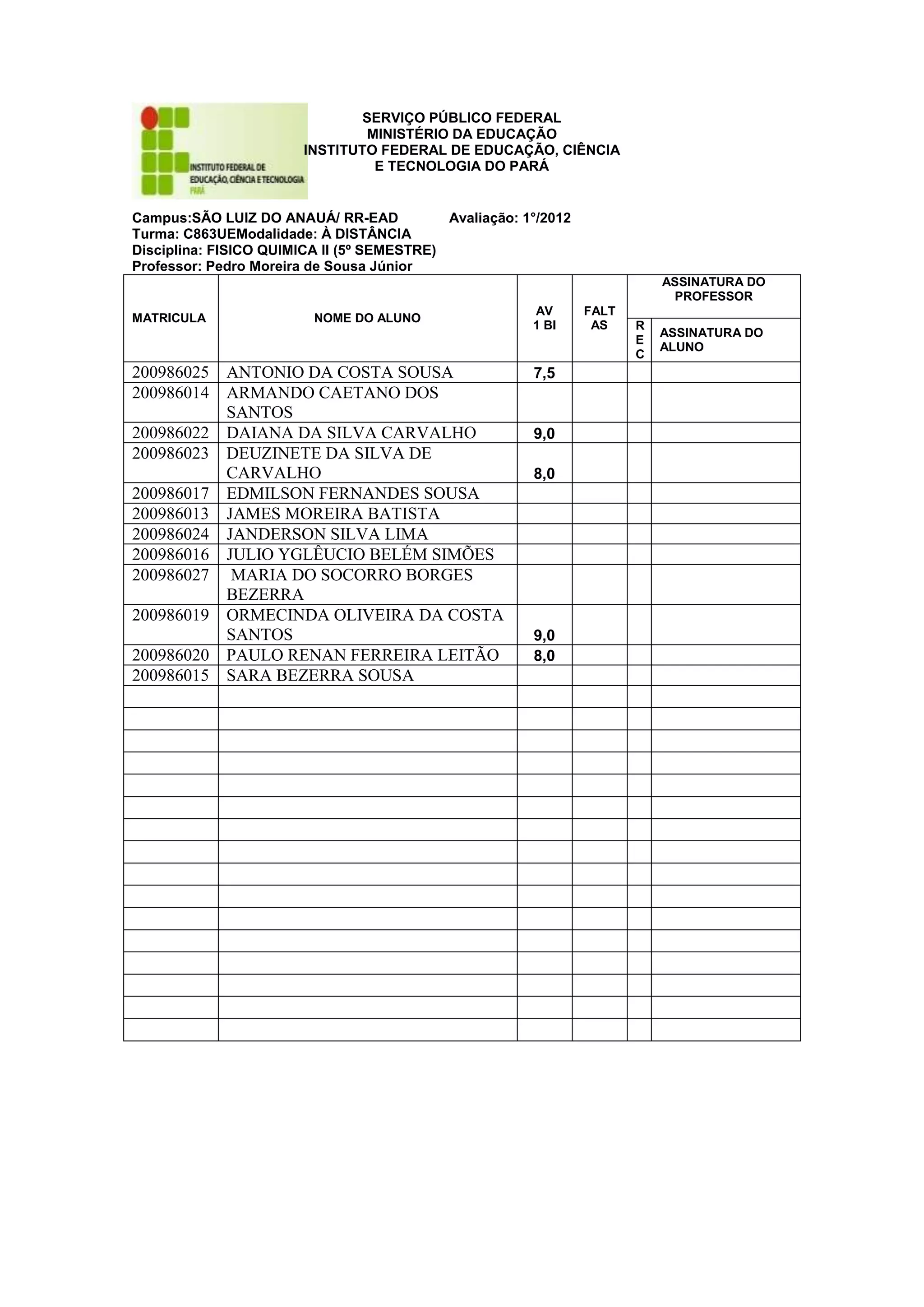 O documento apresenta as notas de avaliação de dois bimestres dos alunos da turma C863 da disciplina de Físico Química II do 5o semestre do curso à distância do Instituto Federal de Educação, Ciência e Tecnologia do Pará, campus de São Luiz do Anauá. Nele constam a matrícula, nome, nota, faltas e assinatura dos alunos e do professor Pedro Moreira de Sousa Júnior.
