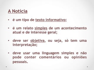 O documento descreve as características e estrutura de uma notícia, incluindo que deve ser um relato objetivo e sem opiniões de um acontecimento atual, com uma linguagem simples, e deve ter um título criativo, um lead respondendo a quem, o quê, onde e quando, e um corpo respondendo como e porquê.
