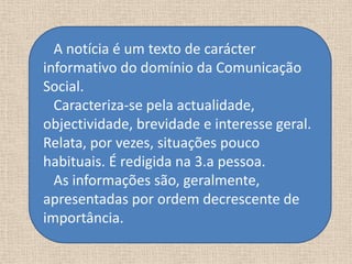 A notícia é um texto informativo caracterizado pela atualidade, objetividade, brevidade e interesse geral. Sua estrutura inclui um lead ou parágrafo-guia no início que resume os fatos principais e responde às perguntas quem, o quê, onde e quando, seguido por um corpo com detalhes adicionais respondendo como e porquê, e um título preciso e expressivo relacionado ao lead.