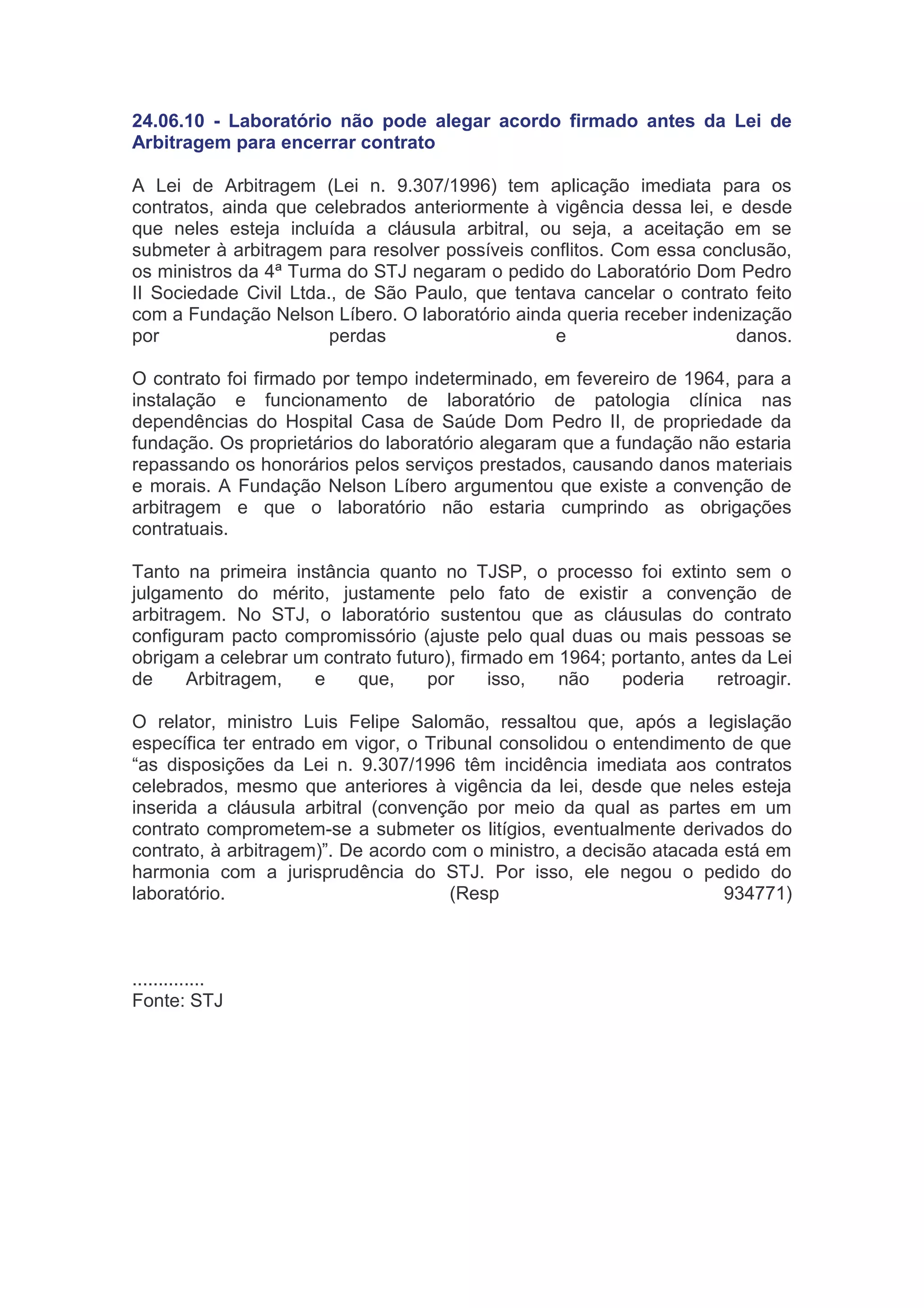 O STJ negou o pedido de um laboratório para encerrar seu contrato com uma fundação alegando um acordo firmado antes da Lei de Arbitragem de 1996. O STJ entendeu que a lei se aplica a contratos anteriores se houver cláusula de arbitragem, como era o caso.