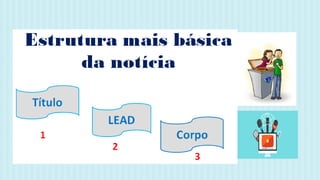O documento discute a estrutura e importância das notícias. Apresenta os elementos essenciais de uma notícia, como título, lead (primeiro parágrafo), corpo e fontes. Destaca a importância das notícias para a troca de informações e comunicação democrática na sociedade globalizada.