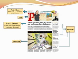 O documento descreve as partes fundamentais de uma notícia, incluindo o título, lead e corpo da notícia. Explica que o título deve conter a informação básica e despertar interesse, enquanto o lead responde a quem, o quê, onde e quando de forma concisa. O corpo da notícia fornece mais detalhes sobre como e porquê o evento ocorreu.