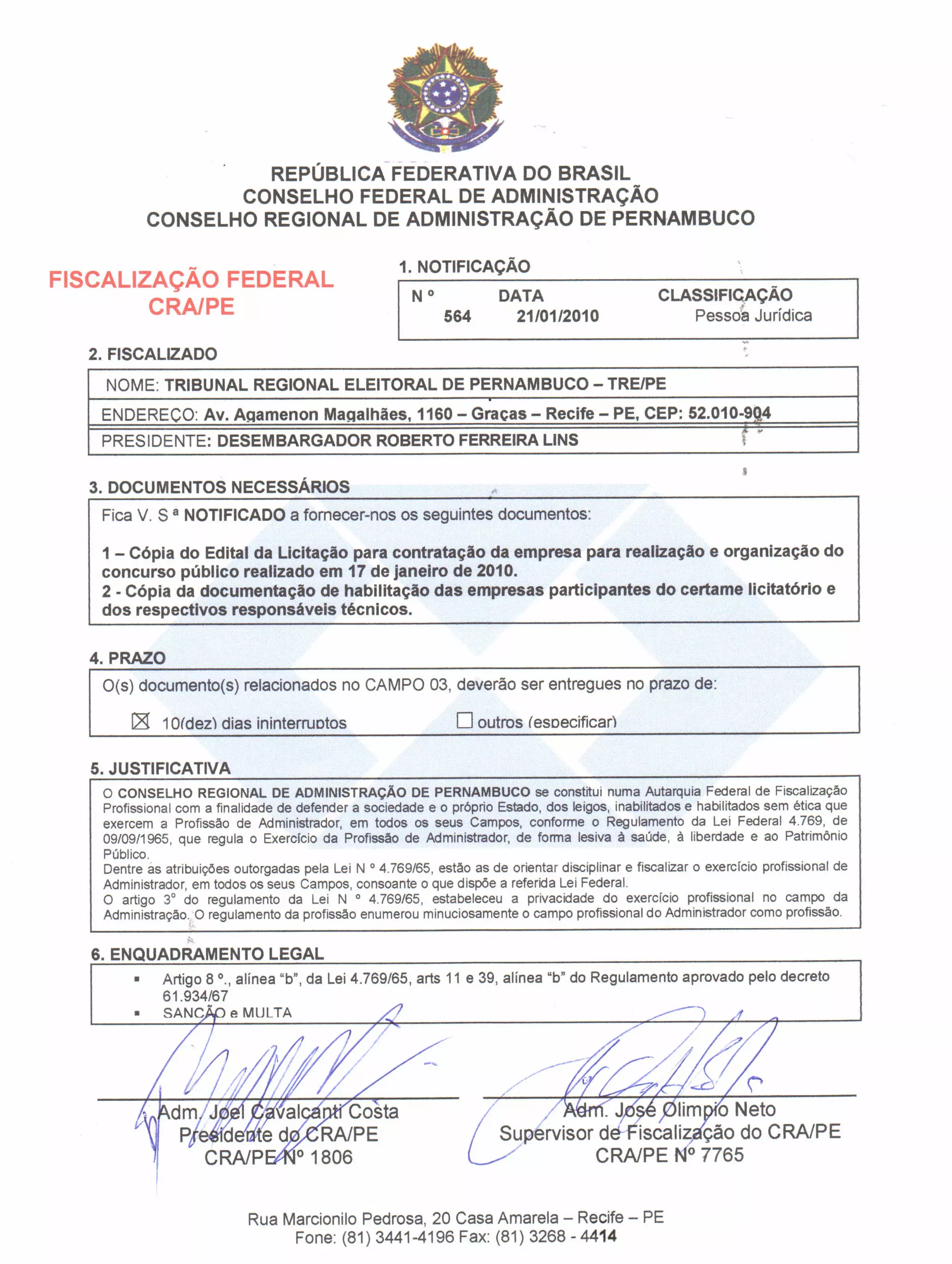 O Tribunal Regional Eleitoral de Pernambuco está sendo notificado a fornecer documentos relacionados à licitação para contratação de empresa para realização de concurso público dentro de 10 dias. O Conselho Regional de Administração de Pernambuco requisita os documentos para fiscalizar se a contratação está de acordo com a lei que regula a profissão de administrador.