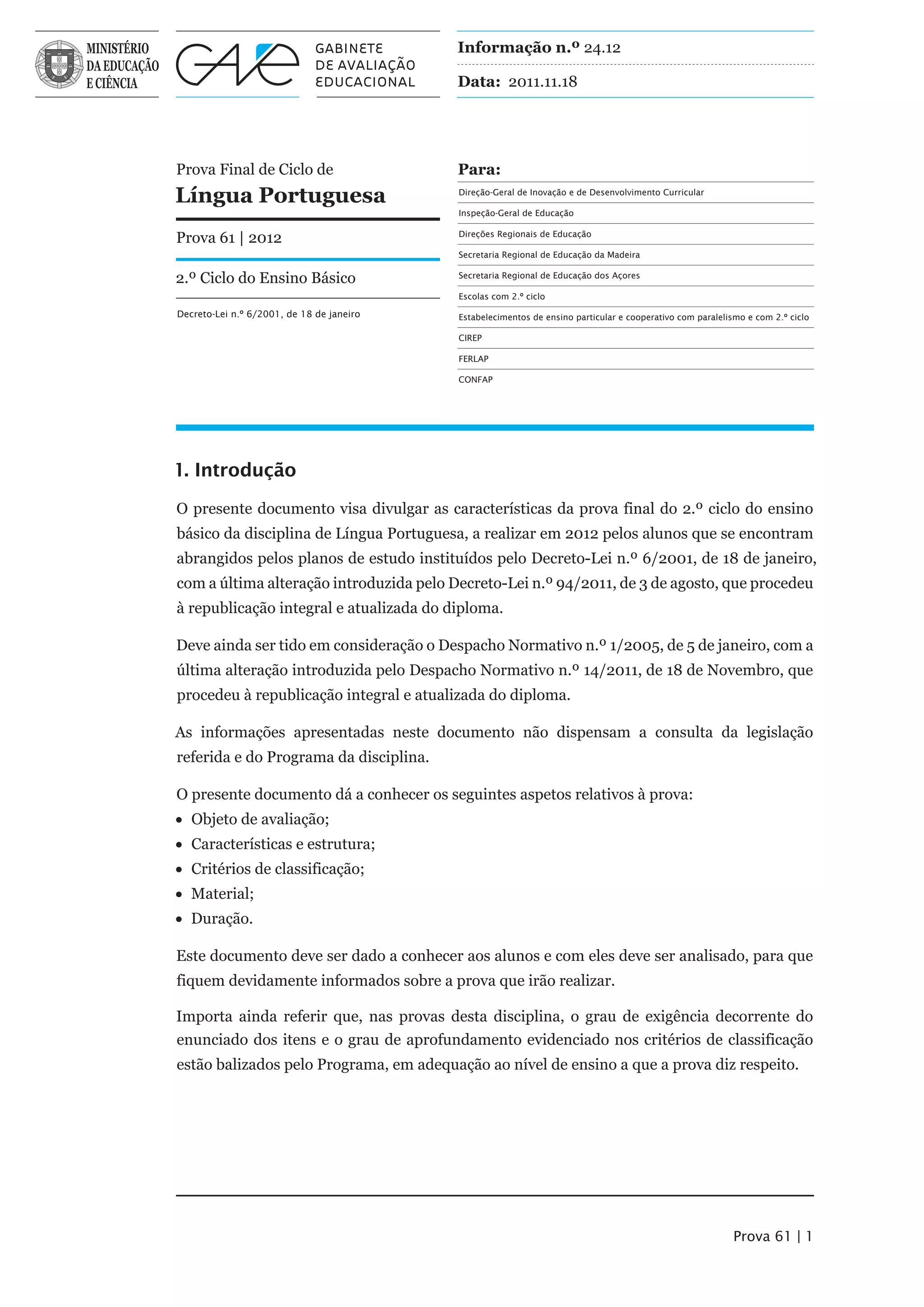 Este documento fornece informações sobre a prova final de Língua Portuguesa do 2o ciclo do ensino básico em 2012, incluindo o objeto de avaliação, características da prova, critérios de classificação e material permitido. A prova avalia competências de leitura, conhecimento da língua e escrita através de itens de seleção e construção. As respostas são classificadas de acordo com critérios organizados por níveis de desempenho.