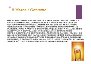 O documento discute o lançamento da cerveja Nova Schin como substituta da Schincariol. A Nova Schin enfrenta forte concorrência de cervejas populares e busca melhorar sua posição no mercado por meio de uma campanha direcionada a jovens que enfatiza valores de modernidade e jovialidade. A estratégia da campanha usa o conceito "ão" para sugerir que a Nova Schin é um "cervejão", de melhor qualidade que as outras marcas.