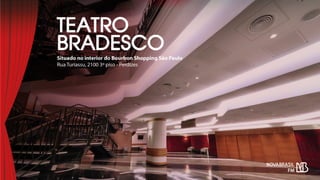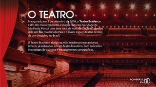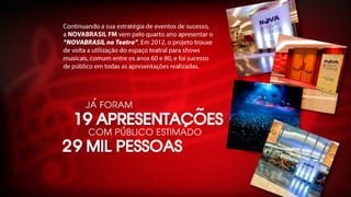 O documento descreve os termos de um patrocínio para divulgação de um projeto no Teatro, incluindo menção na mídia da rádio, número de inserções, cota de ingressos, direito de promoção e ação de marketing no foyer do teatro. O patrocinador terá sua marca ou slogan veiculado por 200 inserções de 5 segundos cada na rádio e outros benefícios de marketing e promoção do evento.