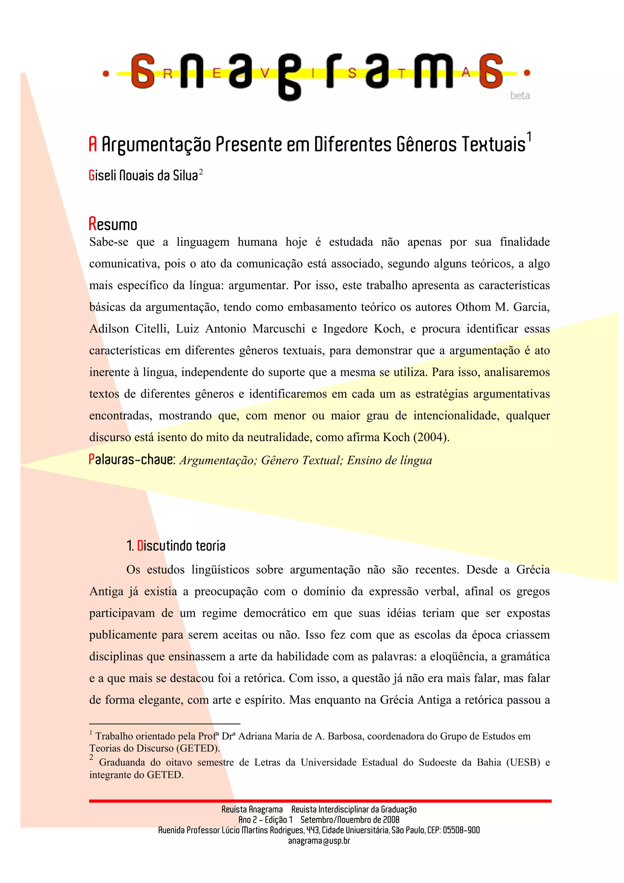 1) O documento discute a presença da argumentação em diferentes gêneros textuais. 2) Teóricos como Othom Garcia, Adilson Citelli e Luiz Antonio Marcuschi fornecem as bases teóricas sobre argumentação e seus elementos. 3) O documento analisará textos de diferentes gêneros para identificar estratégias argumentativas e mostrar que qualquer discurso contém elementos persuasivos.