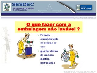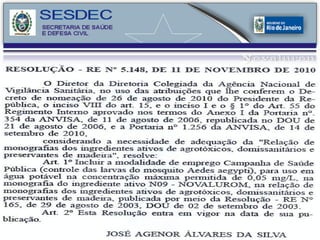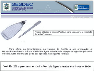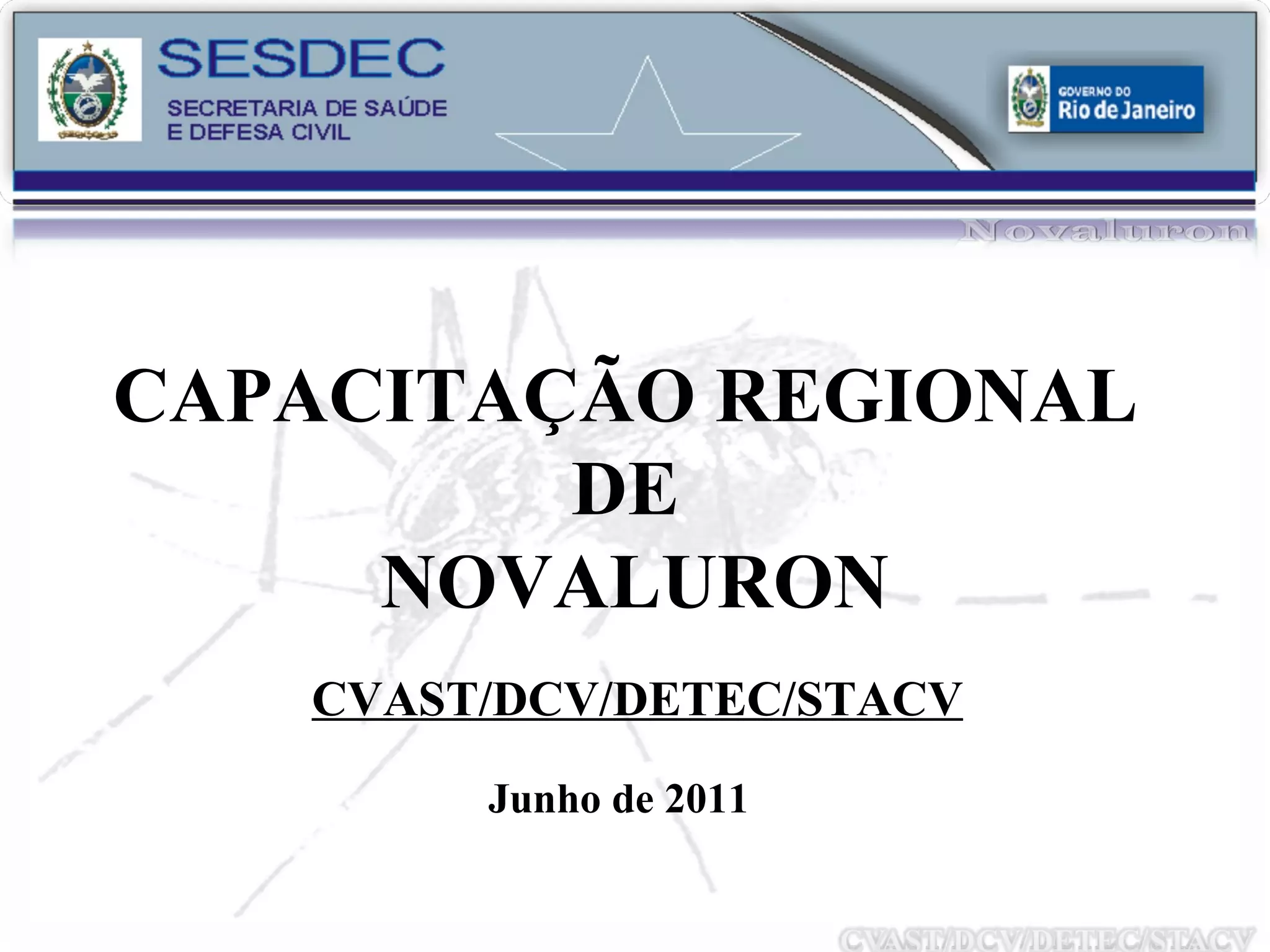 O documento discute métodos de controle do mosquito Aedes aegypti, incluindo mobilização social, redes sociais e controle químico utilizando o inseticida Novaluron. O Novaluron inibe a síntese de quitina nas larvas, pupas e adultos, causando deformidades e esterilidade. Ele possui baixa toxicidade e é eficaz por até 8 semanas no controle do vetor quando aplicado corretamente.