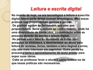 O documento discute a importância das novas tecnologias da informação e comunicação (TICs) na educação nos anos iniciais. As TICs trazem ganhos como acesso ao conhecimento e comunicação, mas também perdas como a falta de manuseio de livros. Cabe aos professores ensinar os alunos a usar as TICs de forma consciente e equilibrada.